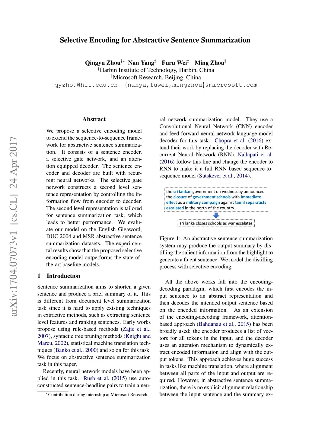 We propose a selective encoding model to extend the sequence-to-sequence framework for abstractive sentence summarization. It consists of a sentence encoder, a selective gate network, and an attention equipped decoder. The sentence encoder and decoder are built with recurrent neural networks. The selective gate network constructs a second level sentence representation by controlling the information flow from encoder to decoder. The second level representation is tailored for sentence summarization task, which leads to better performance. We evaluate our model on the English Gigaword, DUC 2004 and MSR abstractive sentence summarization datasets. The experimental results show that the proposed selective encoding model outperforms the state-of-the-art baseline models.