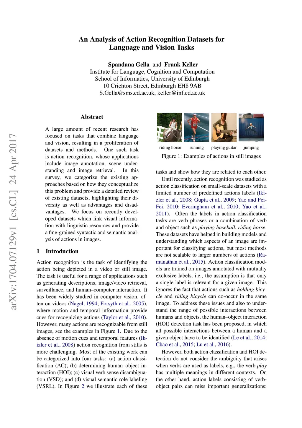 A large amount of recent research has focused on tasks that combine language and vision, resulting in a proliferation of datasets and methods. One such task is action recognition, whose applications include image annotation, scene under- standing and image retrieval. In this survey, we categorize the existing ap- proaches based on how they conceptualize this problem and provide a detailed review of existing datasets, highlighting their di- versity as well as advantages and disad- vantages. We focus on recently devel- oped datasets which link visual informa- tion with linguistic resources and provide a fine-grained syntactic and semantic anal- ysis of actions in images.