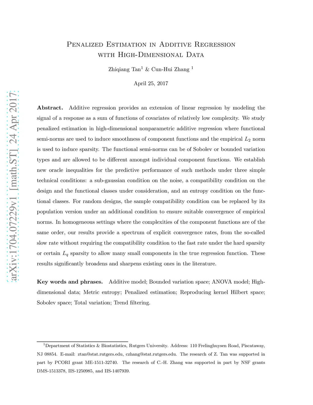 Additive regression provides an extension of linear regression by modeling the signal of a response as a sum of functions of covariates of relatively low complexity. We study penalized estimation in high-dimensional nonparametric additive regression where functional semi-norms are used to induce smoothness of component functions and the empirical norm is used to induce sparsity. The functional semi-norms can be of Sobolev or bounded variation types and are allowed to be different amongst individual component functions. We establish new oracle inequalities for the predictive performance of such methods under three simple technical conditions: a sub-gaussian condition on the noise, a compatibility condition on the design and the functional classes under consideration, and an entropy condition on the functional classes. For random designs, the sample compatibility condition can be replaced by its population version under an additional condition to ensure suitable convergence of empirical norms. In homogeneous settings where the complexities of the component functions are of the same order, our results provide a spectrum of explicit convergence rates, from the so-called slow rate without requiring the compatibility condition to the fast rate under the hard sparsity or certain sparsity to allow many small components in the true regression function. These results significantly broadens and sharpens existing ones in the literature.