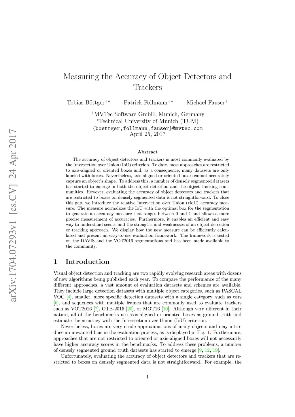 The accuracy of object detectors and trackers is most commonly evaluated by the Intersection over Union (IoU) criterion. To date, most approaches are restricted to axis-aligned or oriented boxes and, as a consequence, many datasets are only labeled with boxes. Nevertheless, axis-aligned or oriented boxes cannot accurately capture an object's shape. To address this, a number of densely segmented datasets has started to emerge in both the object detection and the object tracking communities. However, evaluating the accuracy of object detectors and trackers that are restricted to boxes on densely segmented data is not straightforward. To close this gap, we introduce the relative Intersection over Union (rIoU) accuracy measure. The measure normalizes the IoU with the optimal box for the segmentation to generate an accuracy measure that ranges between 0 and 1 and allows a more precise measurement of accuracies. Furthermore, it enables an efficient and easy way to understand scenes and the strengths and weaknesses of an object detection or tracking approach. We display how the new measure can be efficiently calculated and present an easy-to-use evaluation framework. The framework is tested on the DAVIS and the VOT2016 segmentations and has been made available to the community.
