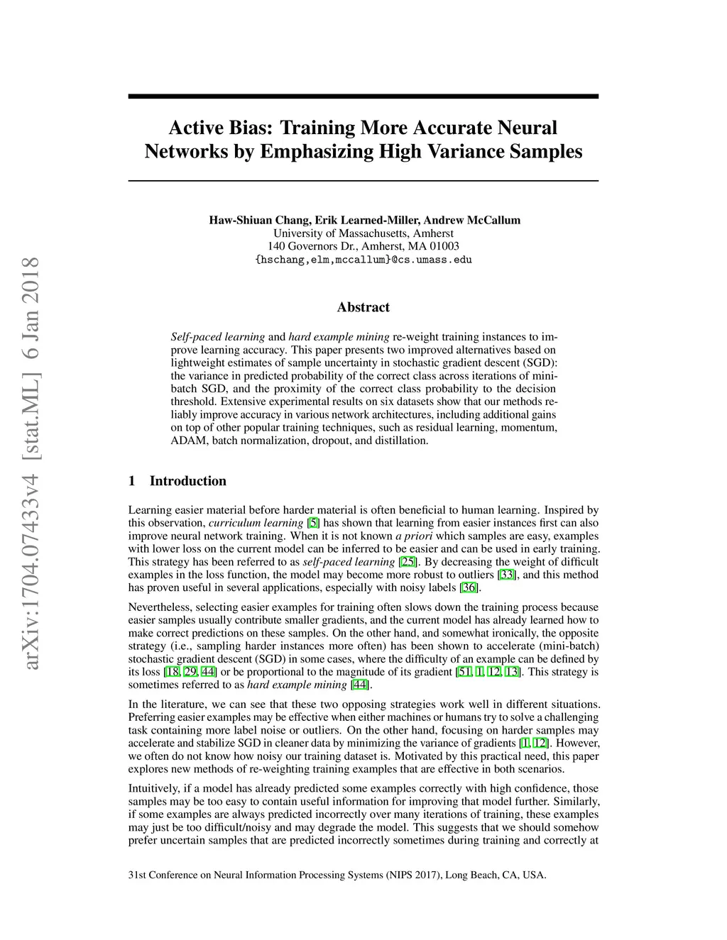 Self-paced learning and hard example mining re-weight training instances to improve learning accuracy. This paper presents two improved alternatives based on lightweight estimates of sample uncertainty in stochastic gradient descent (SGD): the variance in predicted probability of the correct class across iterations of mini-batch SGD, and the proximity of the correct class probability to the decision threshold. Extensive experimental results on six datasets show that our methods reliably improve accuracy in various network architectures, including additional gains on top of other popular training techniques, such as residual learning, momentum, ADAM, batch normalization, dropout, and distillation.