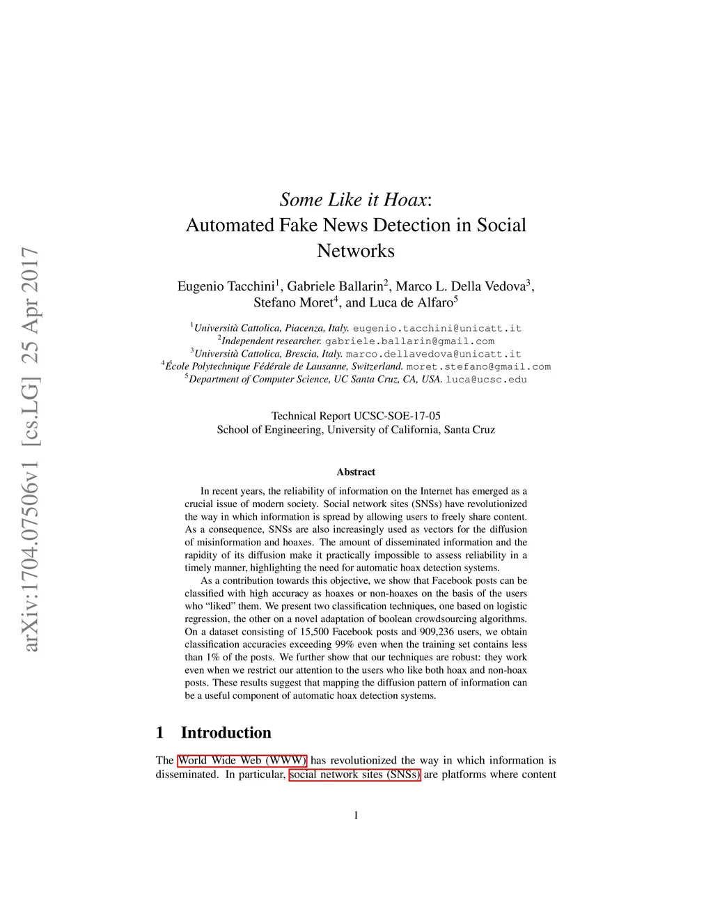 Some Like it Hoax: Automated Fake News Detection in Social Networks