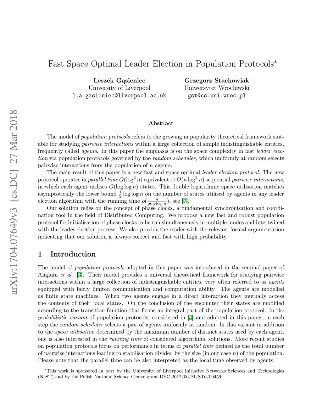 The model of population protocols refers to the growing in popularity theoretical framework suitable for studying pairwise interactions within a large collection of simple indistinguishable entities, frequently called agents. In this paper the emphasis is on the space complexity in fast leader election via population protocols governed by the random scheduler, which uniformly at random selects pairwise interactions within the population of n agents. The main result of this paper is a new fast and space optimal leader election protocol. The new protocol utilises O(log^2 n) parallel time (which is equivalent to O(n log^2 n) sequential pairwise interactions), and each agent operates on O(log log n) states. This double logarithmic space usage matches asymptotically the lower bound 1/2 log log n on the minimal number of states required by agents in any leader election algorithm with the running time o(n/polylog n). Our solution takes an advantage of the concept of phase clocks, a fundamental synchronisation and coordination tool in distributed computing. We propose a new fast and robust population protocol for initialisation of phase clocks to be run simultaneously in multiple modes and intertwined with the leader election process. We also provide the reader with the relevant formal argumentation indicating that our solution is always correct, and fast with high probability.