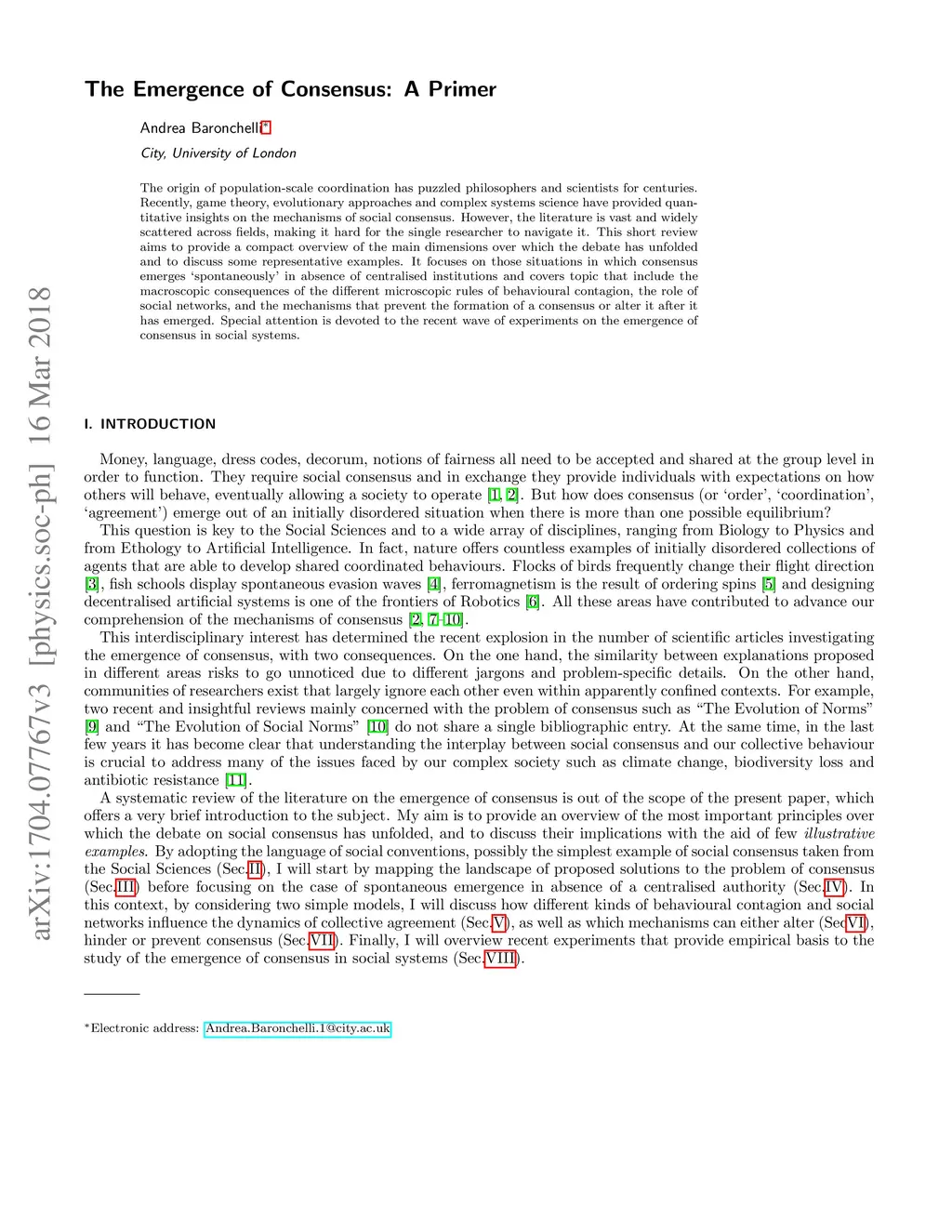 The origin of population-scale coordination has puzzled philosophers and scientists for centuries. Recently, game theory, evolutionary approaches and complex systems science have provided quantitative insights on the mechanisms of social consensus. However, the literature is vast and widely scattered across fields, making it hard for the single researcher to navigate it. This short review aims to provide a compact overview of the main dimensions over which the debate has unfolded and to discuss some representative examples. It focuses on those situations in which consensus emerges 'spontaneously' in absence of centralised institutions and covers topic that include the macroscopic consequences of the different microscopic rules of behavioural contagion, the role of social networks, and the mechanisms that prevent the formation of a consensus or alter it after it has emerged. Special attention is devoted to the recent wave of experiments on the emergence of consensus in social systems.