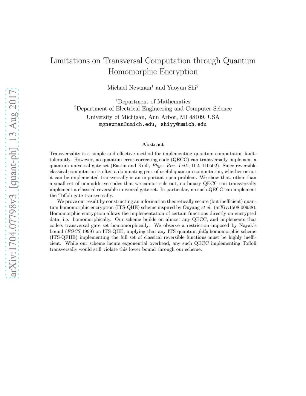 Transversality is a simple and effective method for implementing quantum computation fault-tolerantly. However, no quantum error-correcting code (QECC) can transversally implement a quantum universal gate set (Eastin and Knill, Phys. Rev. Lett., 102, 110502). Since reversible classical computation is often a dominating part of useful quantum computation, whether or not it can be implemented transversally is an important open problem. We show that, other than a small set of non-additive codes that we cannot rule out, no binary QECC can transversally implement a classical reversible universal gate set. In particular, no such QECC can implement the Toffoli gate transversally. We prove our result by constructing an information theoretically secure (but inefficient) quantum homomorphic encryption (ITS-QHE) scheme inspired by Ouyang et al. (arXiv:1508.00938). Homomorphic encryption allows the implementation of certain functions directly on encrypted data, i.e. homomorphically. Our scheme builds on almost any QECC, and implements that code's transversal gate set homomorphically. We observe a restriction imposed by Nayak's bound (FOCS 1999) on ITS-QHE, implying that any ITS quantum fully homomorphic scheme (ITS-QFHE) implementing the full set of classical reversible functions must be highly inefficient. While our scheme incurs exponential overhead, any such QECC implementing Toffoli transversally would still violate this lower bound through our scheme.