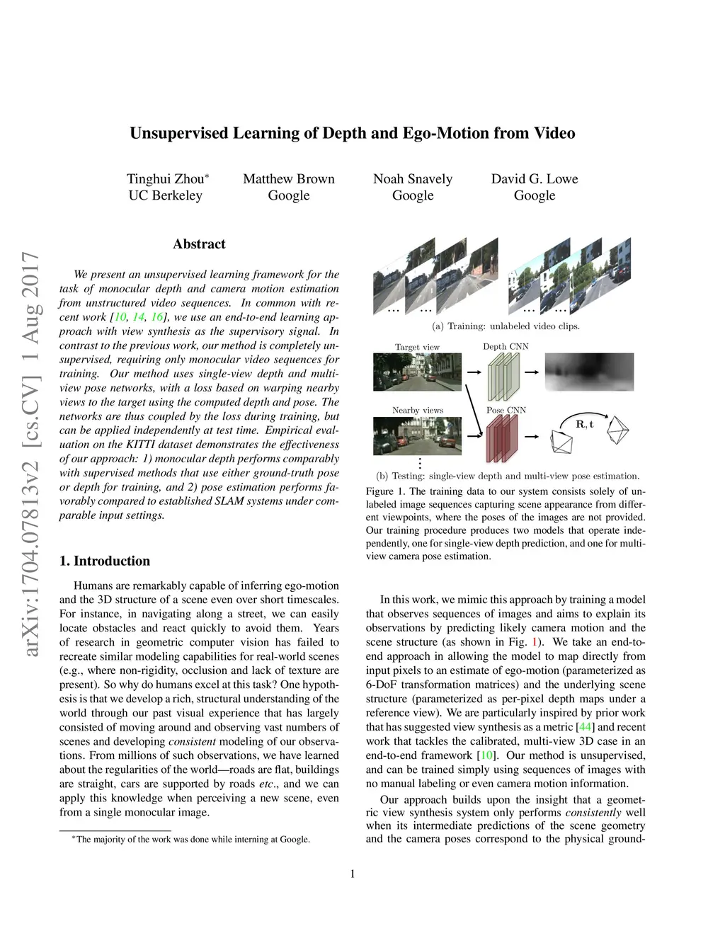 We present an unsupervised learning framework for the task of monocular depth and camera motion estimation from unstructured video sequences. We achieve this by simultaneously training depth and camera pose estimation networks using the task of view synthesis as the supervisory signal. The networks are thus coupled via the view synthesis objective during training, but can be applied independently at test time. Empirical evaluation on the KITTI dataset demonstrates the effectiveness of our approach: 1) monocular depth performing comparably with supervised methods that use either ground-truth pose or depth for training, and 2) pose estimation performing favorably with established SLAM systems under comparable input settings.