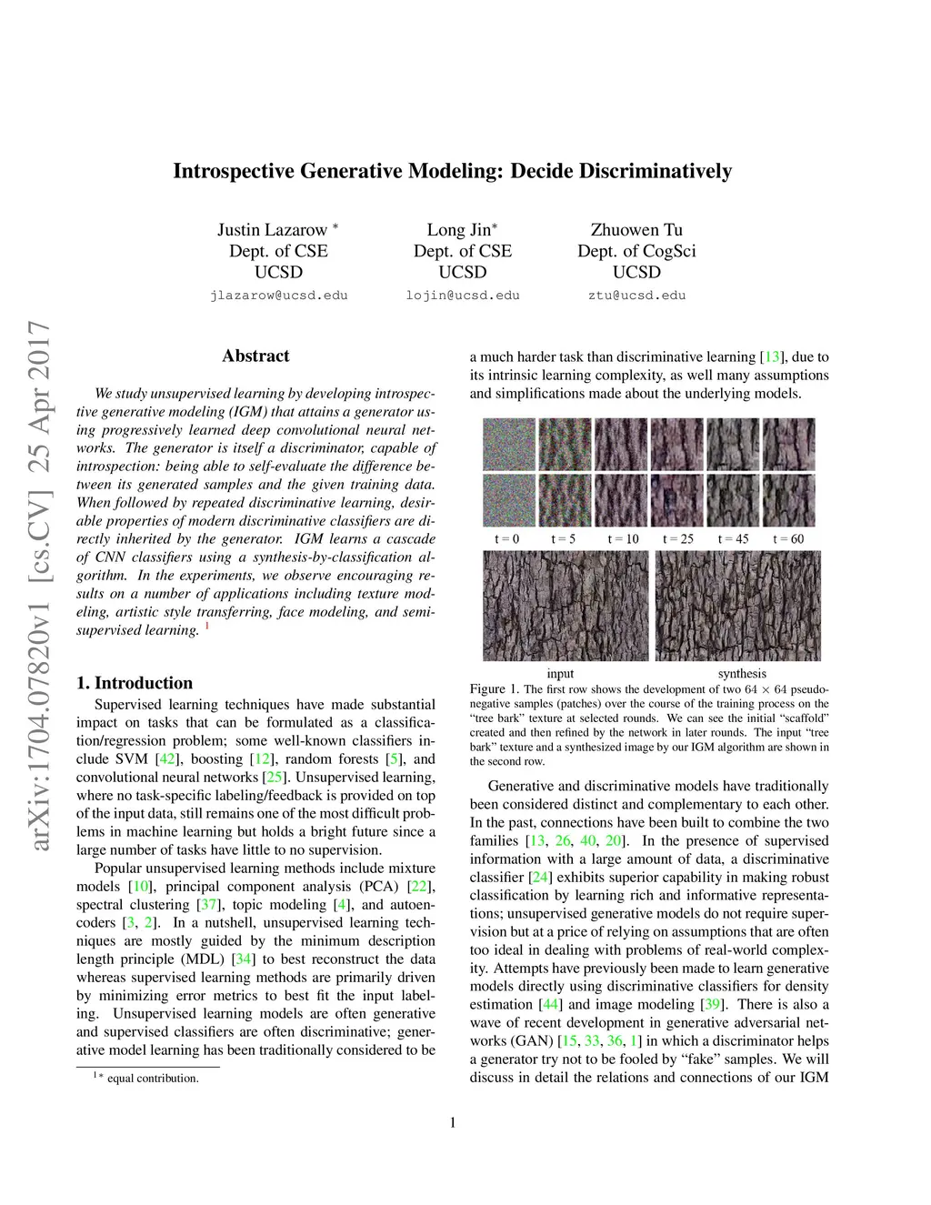 We study unsupervised learning by developing introspective generative modeling (IGM) that attains a generator using progressively learned deep convolutional neural networks. The generator is itself a discriminator, capable of introspection: being able to self-evaluate the difference between its generated samples and the given training data. When followed by repeated discriminative learning, desirable properties of modern discriminative classifiers are directly inherited by the generator. IGM learns a cascade of CNN classifiers using a synthesis-by-classification algorithm. In the experiments, we observe encouraging results on a number of applications including texture modeling, artistic style transferring, face modeling, and semi-supervised learning.
