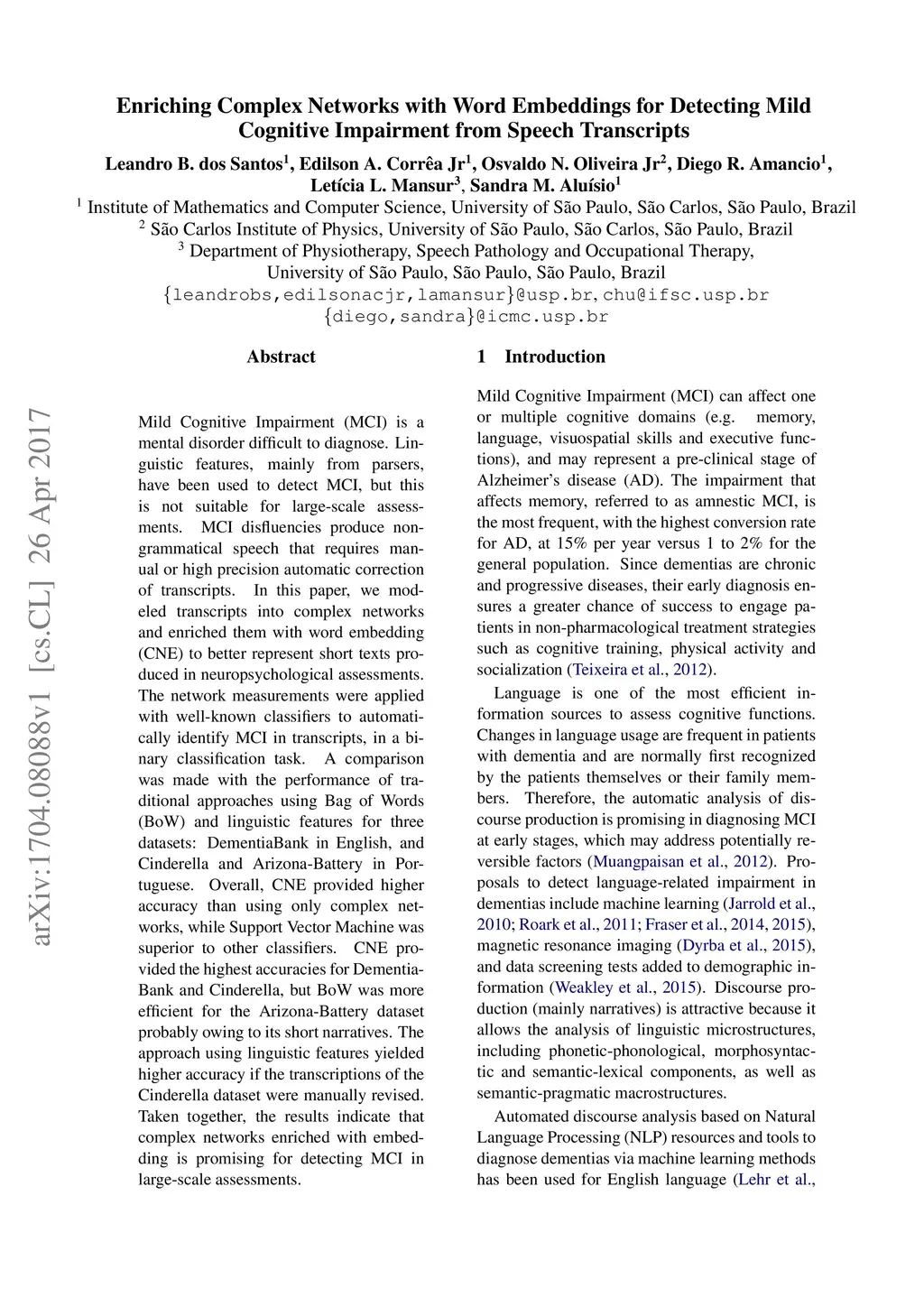Mild Cognitive Impairment (MCI) is a mental disorder difficult to diagnose. Linguistic features, mainly from parsers, have been used to detect MCI, but this is not suitable for large-scale assessments. MCI disfluencies produce non-grammatical speech that requires manual or high precision automatic correction of transcripts. In this paper, we modeled transcripts into complex networks and enriched them with word embedding (CNE) to better represent short texts produced in neuropsychological assessments. The network measurements were applied with well-known classifiers to automatically identify MCI in transcripts, in a binary classification task. A comparison was made with the performance of traditional approaches using Bag of Words (BoW) and linguistic features for three datasets: DementiaBank in English, and Cinderella and Arizona-Battery in Portuguese. Overall, CNE provided higher accuracy than using only complex networks, while Support Vector Machine was superior to other classifiers. CNE provided the highest accuracies for DementiaBank and Cinderella, but BoW was more efficient for the Arizona-Battery dataset probably owing to its short narratives. The approach using linguistic features yielded higher accuracy if the transcriptions of the Cinderella dataset were manually revised. Taken together, the results indicate that complex networks enriched with embedding is promising for detecting MCI in large-scale assessments