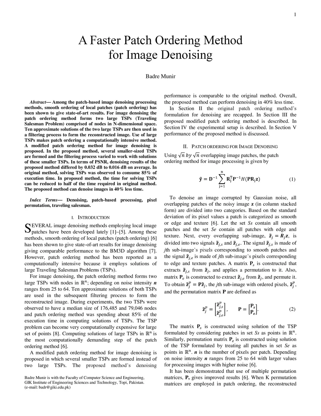 Among the patch-based image denoising processing methods, smooth ordering of local patches (patch ordering) has been shown to give state-of-art results. For image denoising the patch ordering method forms two large TSPs (Traveling Salesman Problem) comprised of nodes in N-dimensional space. Ten approximate solutions of the two large TSPs are then used in a filtering process to form the reconstructed image. Use of large TSPs makes patch ordering a computationally intensive method. A modified patch ordering method for image denoising is proposed. In the proposed method, several smaller-sized TSPs are formed and the filtering process varied to work with solutions of these smaller TSPs. In terms of PSNR, denoising results of the proposed method differed by 0.032 dB to 0.016 dB on average. In original method, solving TSPs was observed to consume 85% of execution time. In proposed method, the time for solving TSPs can be reduced to half of the time required in original method. The proposed method can denoise images in 40% less time.