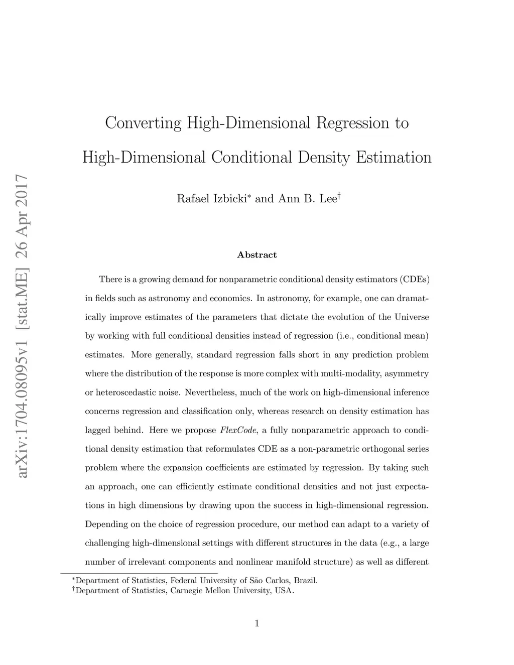 There is a growing demand for nonparametric conditional density estimators (CDEs) in fields such as astronomy and economics. In astronomy, for example, one can dramatically improve estimates of the parameters that dictate the evolution of the Universe by working with full conditional densities instead of regression (i.e., conditional mean) estimates. More generally, standard regression falls short in any prediction problem where the distribution of the response is more complex with multi-modality, asymmetry or heteroscedastic noise. Nevertheless, much of the work on high-dimensional inference concerns regression and classification only, whereas research on density estimation has lagged behind. Here we propose FlexCode, a fully nonparametric approach to conditional density estimation that reformulates CDE as a non-parametric orthogonal series problem where the expansion coefficients are estimated by regression. By taking such an approach, one can efficiently estimate conditional densities and not just expectations in high dimensions by drawing upon the success in high-dimensional regression. Depending on the choice of regression procedure, our method can adapt to a variety of challenging high-dimensional settings with different structures in the data (e.g., a large number of irrelevant components and nonlinear manifold structure) as well as different data types (e.g., functional data, mixed data types and sample sets). We study the theoretical and empirical performance of our proposed method, and we compare our approach with traditional conditional density estimators on simulated as well as real-world data, such as photometric galaxy data, Twitter data, and line-of-sight velocities in a galaxy cluster.