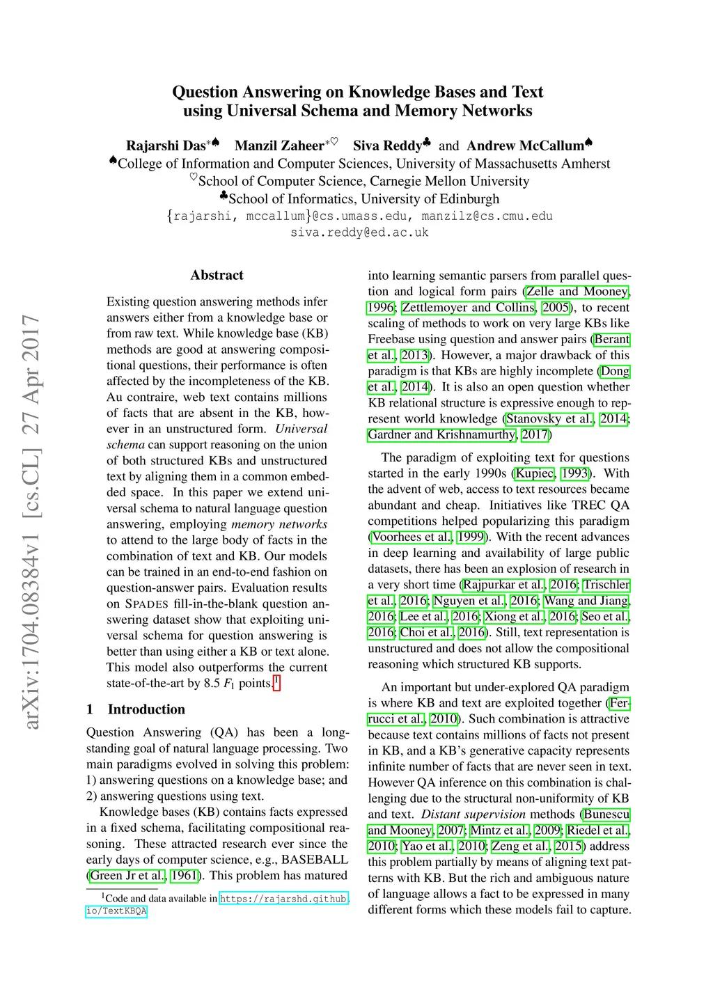 Question Answering on Knowledge Bases and Text using Universal Schema