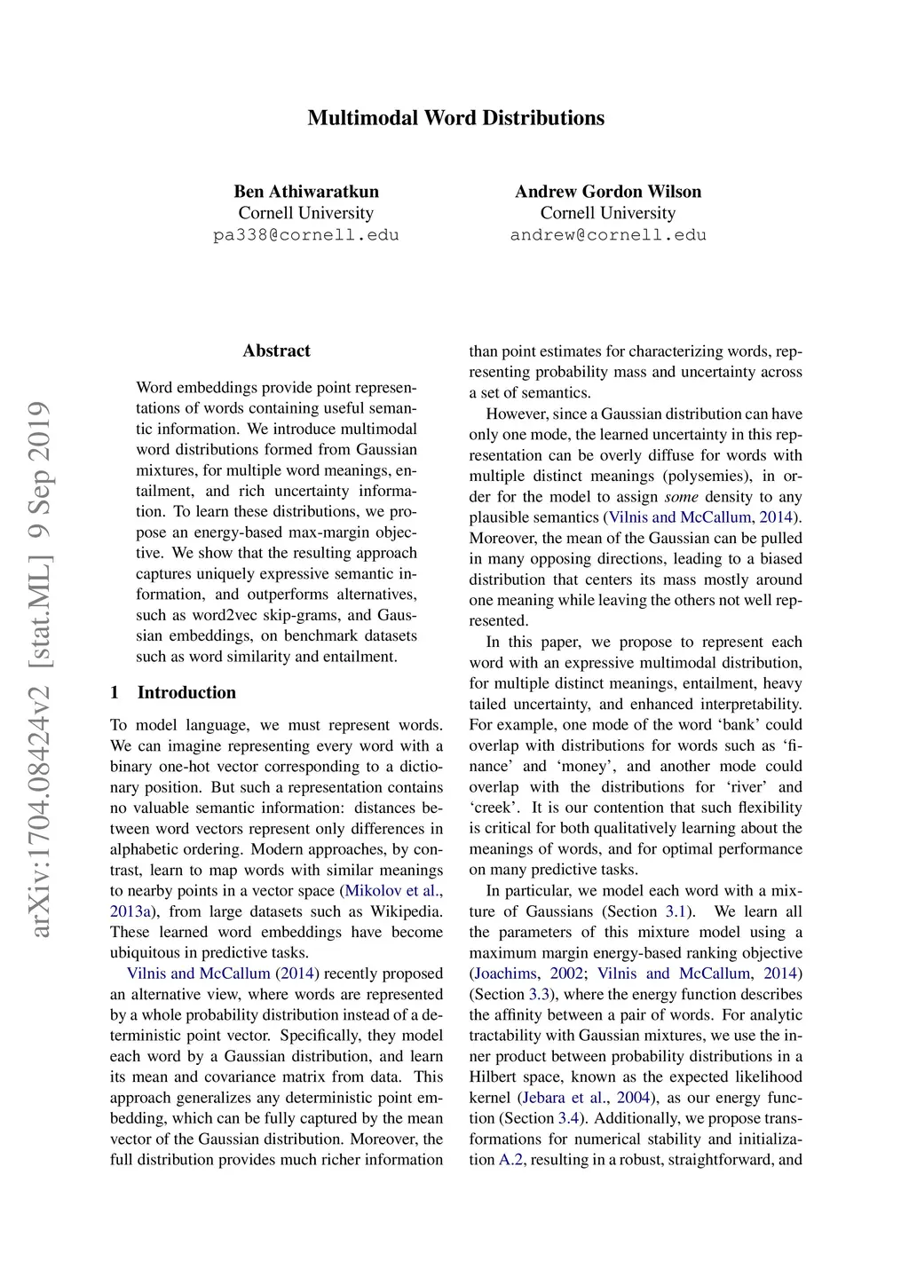 Word embeddings provide point representations of words containing useful semantic information. We introduce multimodal word distributions formed from Gaussian mixtures, for multiple word meanings, entailment, and rich uncertainty information. To learn these distributions, we propose an energy-based max-margin objective. We show that the resulting approach captures uniquely expressive semantic information, and outperforms alternatives, such as word2vec skip-grams, and Gaussian embeddings, on benchmark datasets such as word similarity and entailment.