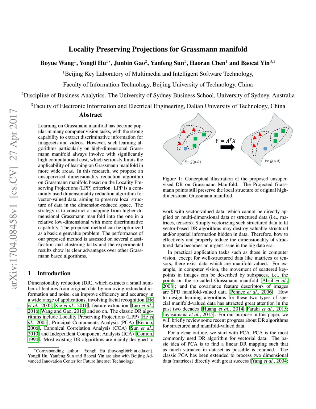 Learning on Grassmann manifold has become popular in many computer vision tasks, with the strong capability to extract discriminative information for imagesets and videos. However, such learning algorithms particularly on high-dimensional Grassmann manifold always involve with significantly high computational cost, which seriously limits the applicability of learning on Grassmann manifold in more wide areas. In this research, we propose an unsupervised dimensionality reduction algorithm on Grassmann manifold based on the Locality Preserving Projections (LPP) criterion. LPP is a commonly used dimensionality reduction algorithm for vector-valued data, aiming to preserve local structure of data in the dimension-reduced space. The strategy is to construct a mapping from higher dimensional Grassmann manifold into the one in a relative low-dimensional with more discriminative capability. The proposed method can be optimized as a basic eigenvalue problem. The performance of our proposed method is assessed on several classification and clustering tasks and the experimental results show its clear advantages over other Grassmann based algorithms.