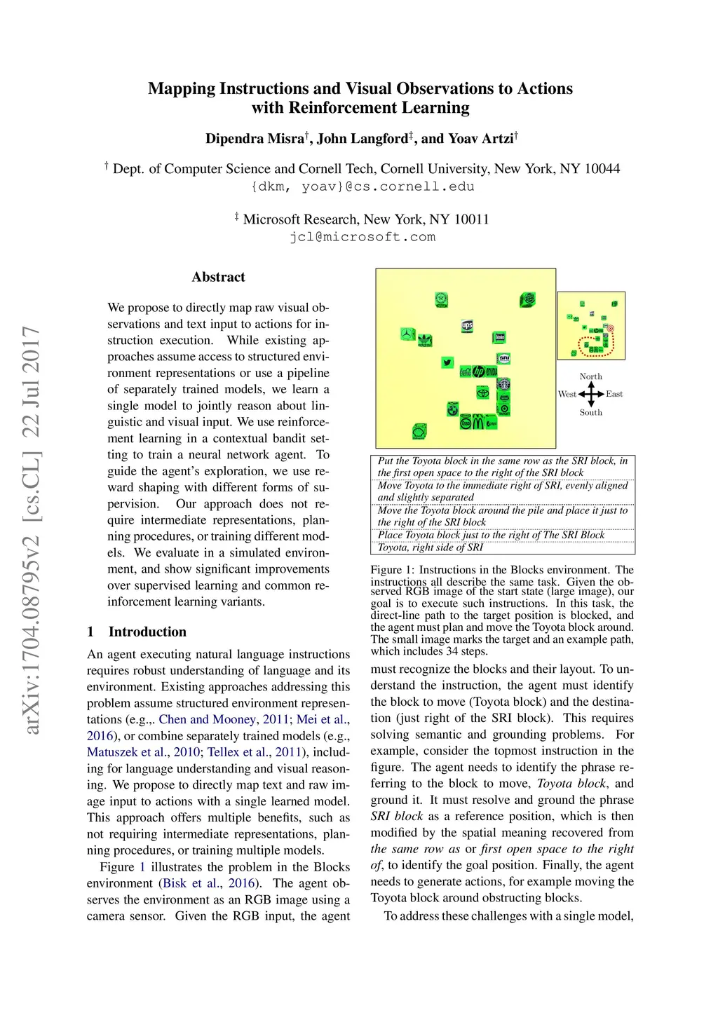 We propose to directly map raw visual observations and text input to actions for instruction execution. While existing approaches assume access to structured environment representations or use a pipeline of separately trained models, we learn a single model to jointly reason about linguistic and visual input. We use reinforcement learning in a contextual bandit setting to train a neural network agent. To guide the agent's exploration, we use reward shaping with different forms of supervision. Our approach does not require intermediate representations, planning procedures, or training different models. We evaluate in a simulated environment, and show significant improvements over supervised learning and common reinforcement learning variants.