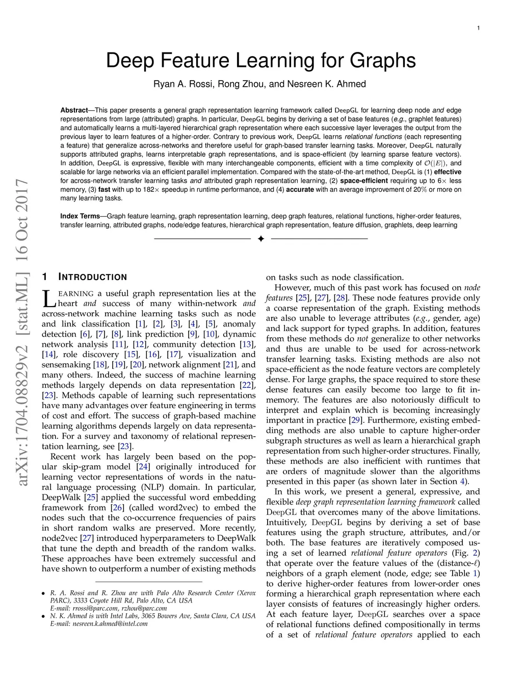 This paper presents a general graph representation learning framework called DeepGL for learning deep node and edge representations from large (attributed) graphs. In particular, DeepGL begins by deriving a set of base features (e.g., graphlet features) and automatically learns a multi-layered hierarchical graph representation where each successive layer leverages the output from the previous layer to learn features of a higher-order. Contrary to previous work, DeepGL learns relational functions (each representing a feature) that generalize across-networks and therefore useful for graph-based transfer learning tasks. Moreover, DeepGL naturally supports attributed graphs, learns interpretable features, and is space-efficient (by learning sparse feature vectors). In addition, DeepGL is expressive, flexible with many interchangeable components, efficient with a time complexity of , and scalable for large networks via an efficient parallel implementation. Compared with the state-of-the-art method, DeepGL is (1) effective for across-network transfer learning tasks and attributed graph representation learning, (2) space-efficient requiring up to 6x less memory, (3) fast with up to 182x speedup in runtime performance, and (4) accurate with an average improvement of 20% or more on many learning tasks.