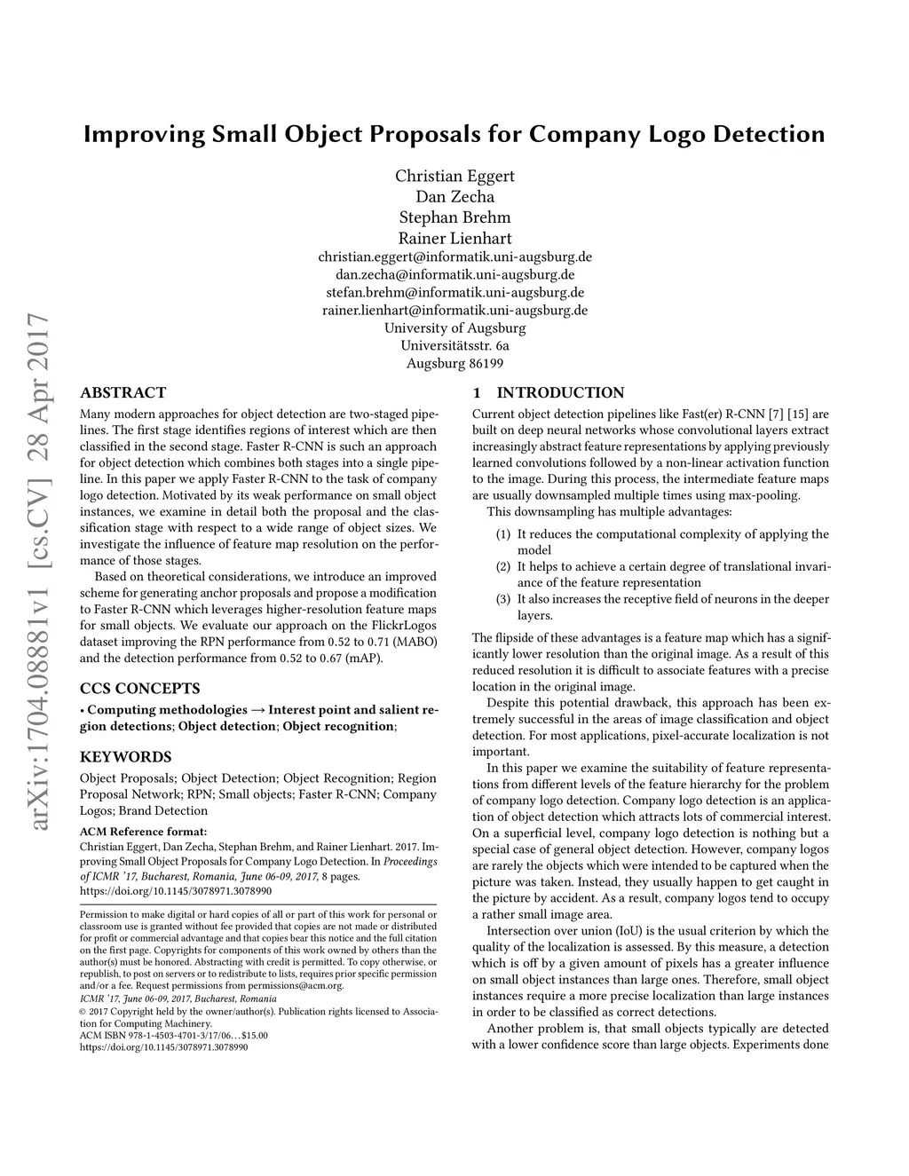 Many modern approaches for object detection are two-staged pipelines. The first stage identifies regions of interest which are then classified in the second stage. Faster R-CNN is such an approach for object detection which combines both stages into a single pipeline. In this paper we apply Faster R-CNN to the task of company logo detection. Motivated by its weak performance on small object instances, we examine in detail both the proposal and the classification stage with respect to a wide range of object sizes. We investigate the influence of feature map resolution on the performance of those stages. Based on theoretical considerations, we introduce an improved scheme for generating anchor proposals and propose a modification to Faster R-CNN which leverages higher-resolution feature maps for small objects. We evaluate our approach on the FlickrLogos dataset improving the RPN performance from 0.52 to 0.71 (MABO) and the detection performance from 0.52 to 0.67 (mAP).