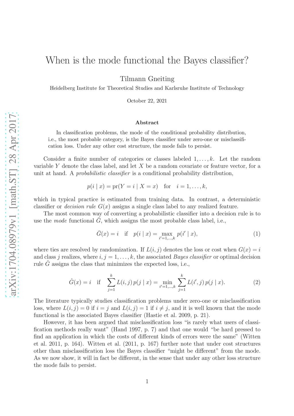 In classification problems, the mode of the conditional probability distribution, i.e., the most probable category, is the Bayes classifier under zero-one or misclassification loss. Under any other cost structure, the mode fails to persist.