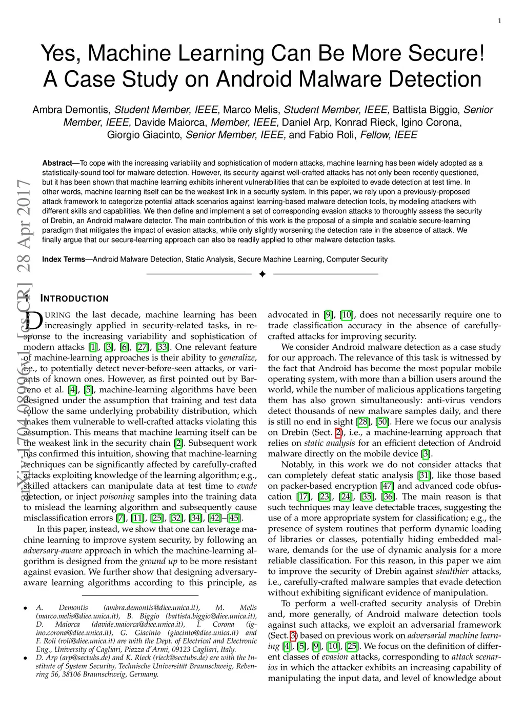 To cope with the increasing variability and sophistication of modern attacks, machine learning has been widely adopted as a statistically-sound tool for malware detection. However, its security against well-crafted attacks has not only been recently questioned, but it has been shown that machine learning exhibits inherent vulnerabilities that can be exploited to evade detection at test time. In other words, machine learning itself can be the weakest link in a security system. In this paper, we rely upon a previously-proposed attack framework to categorize potential attack scenarios against learning-based malware detection tools, by modeling attackers with different skills and capabilities. We then define and implement a set of corresponding evasion attacks to thoroughly assess the security of Drebin, an Android malware detector. The main contribution of this work is the proposal of a simple and scalable secure-learning paradigm that mitigates the impact of evasion attacks, while only slightly worsening the detection rate in the absence of attack. We finally argue that our secure-learning approach can also be readily applied to other malware detection tasks.