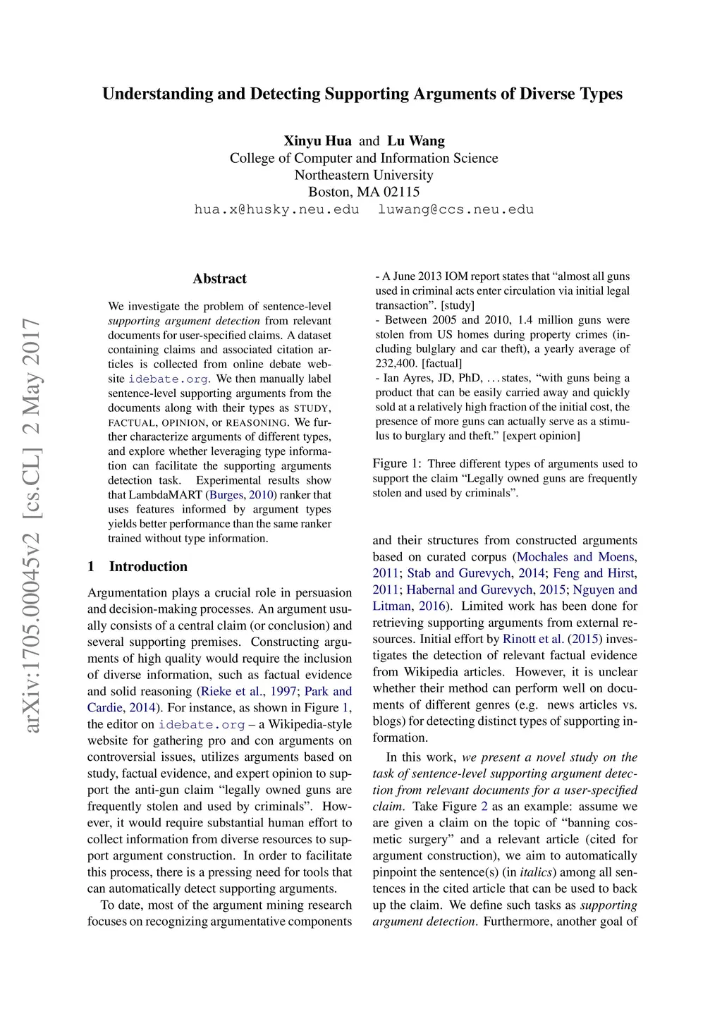 We investigate the problem of sentence-level supporting argument detection from relevant documents for user-specified claims. A dataset containing claims and associated citation articles is collected from online debate website idebate.org. We then manually label sentence-level supporting arguments from the documents along with their types as study, factual, opinion, or reasoning. We further characterize arguments of different types, and explore whether leveraging type information can facilitate the supporting arguments detection task. Experimental results show that LambdaMART (Burges, 2010) ranker that uses features informed by argument types yields better performance than the same ranker trained without type information.