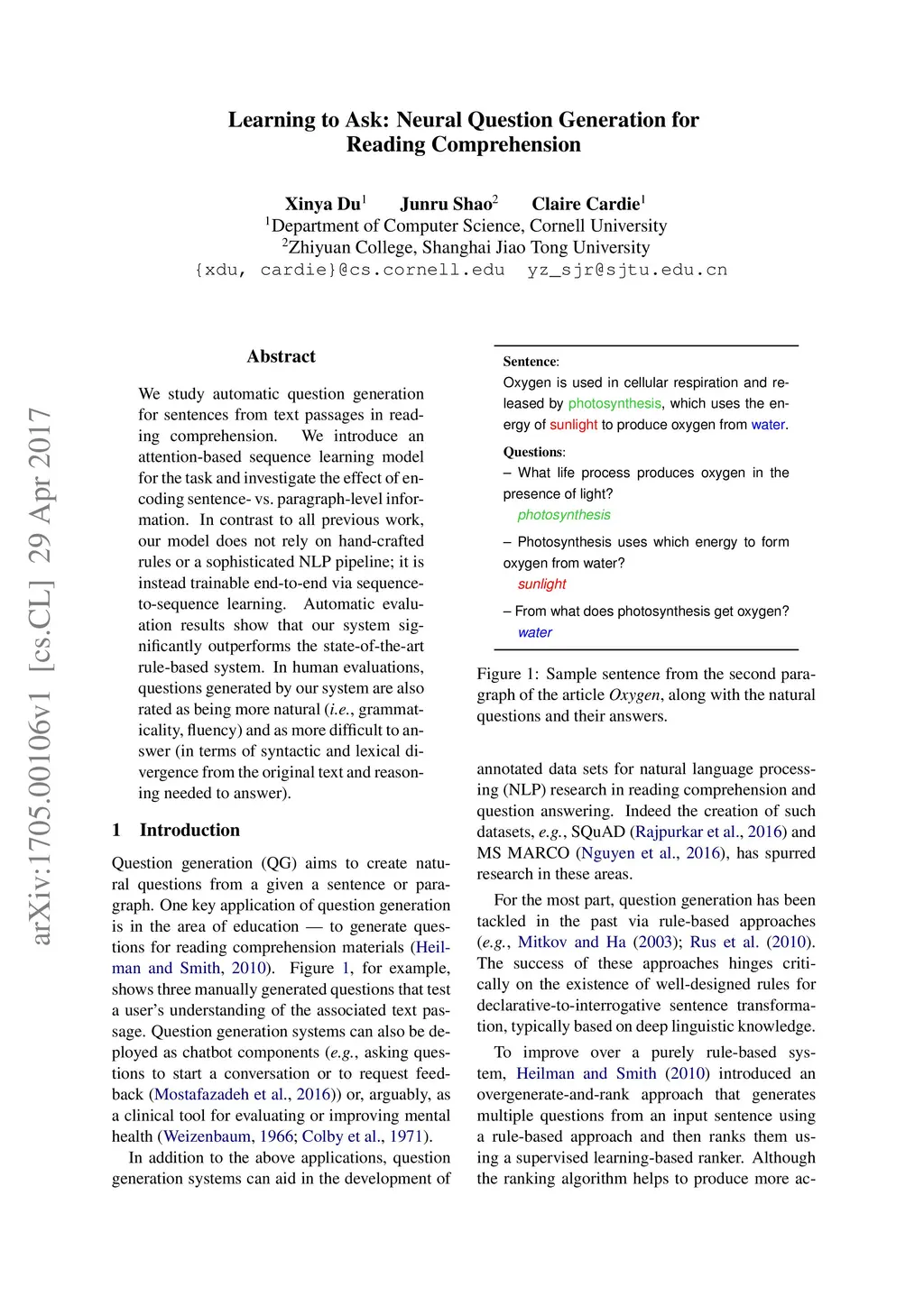 Learning to Ask: Neural Question Generation for Reading Comprehension