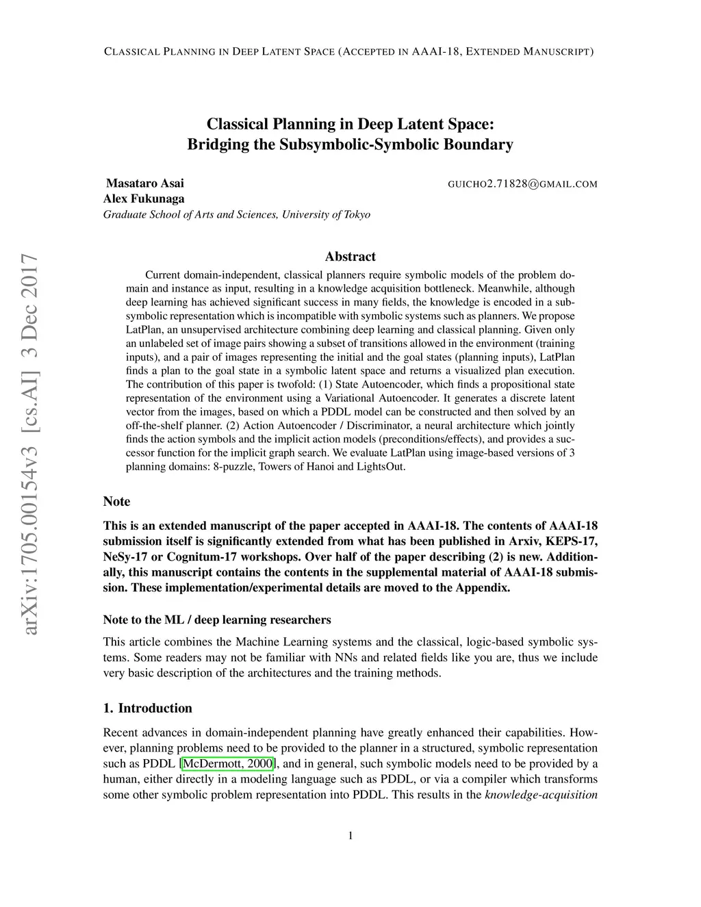 Current domain-independent, classical planners require symbolic models of the problem domain and instance as input, resulting in a knowledge acquisition bottleneck. Meanwhile, although deep learning has achieved significant success in many fields, the knowledge is encoded in a subsymbolic representation which is incompatible with symbolic systems such as planners. We propose LatPlan, an unsupervised architecture combining deep learning and classical planning. Given only an unlabeled set of image pairs showing a subset of transitions allowed in the environment (training inputs), and a pair of images representing the initial and the goal states (planning inputs), LatPlan finds a plan to the goal state in a symbolic latent space and returns a visualized plan execution. The contribution of this paper is twofold: (1) State Autoencoder, which finds a propositional state representation of the environment using a Variational Autoencoder. It generates a discrete latent vector from the images, based on which a PDDL model can be constructed and then solved by an off-the-shelf planner. (2) Action Autoencoder / Discriminator, a neural architecture which jointly finds the action symbols and the implicit action models (preconditions/effects), and provides a successor function for the implicit graph search. We evaluate LatPlan using image-based versions of 3 planning domains: 8-puzzle, Towers of Hanoi and LightsOut.