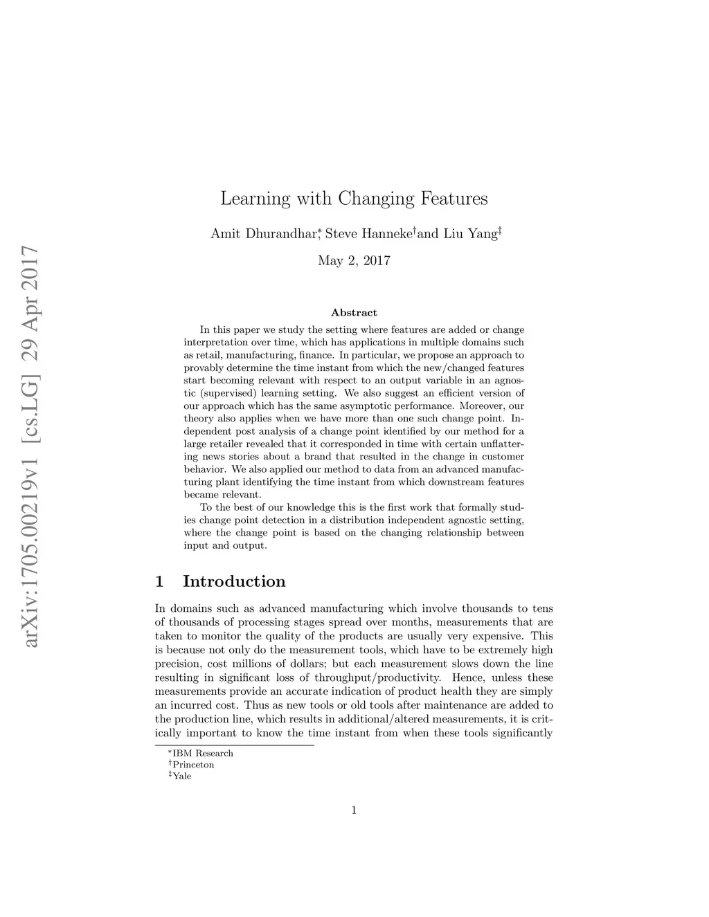 In this paper we study the setting where features are added or change interpretation over time, which has applications in multiple domains such as retail, manufacturing, finance. In particular, we propose an approach to provably determine the time instant from which the new/changed features start becoming relevant with respect to an output variable in an agnostic (supervised) learning setting. We also suggest an efficient version of our approach which has the same asymptotic performance. Moreover, our theory also applies when we have more than one such change point. Independent post analysis of a change point identified by our method for a large retailer revealed that it corresponded in time with certain unflattering news stories about a brand that resulted in the change in customer behavior. We also applied our method to data from an advanced manufacturing plant identifying the time instant from which downstream features became relevant. To the best of our knowledge this is the first work that formally studies change point detection in a distribution independent agnostic setting, where the change point is based on the changing relationship between input and output.