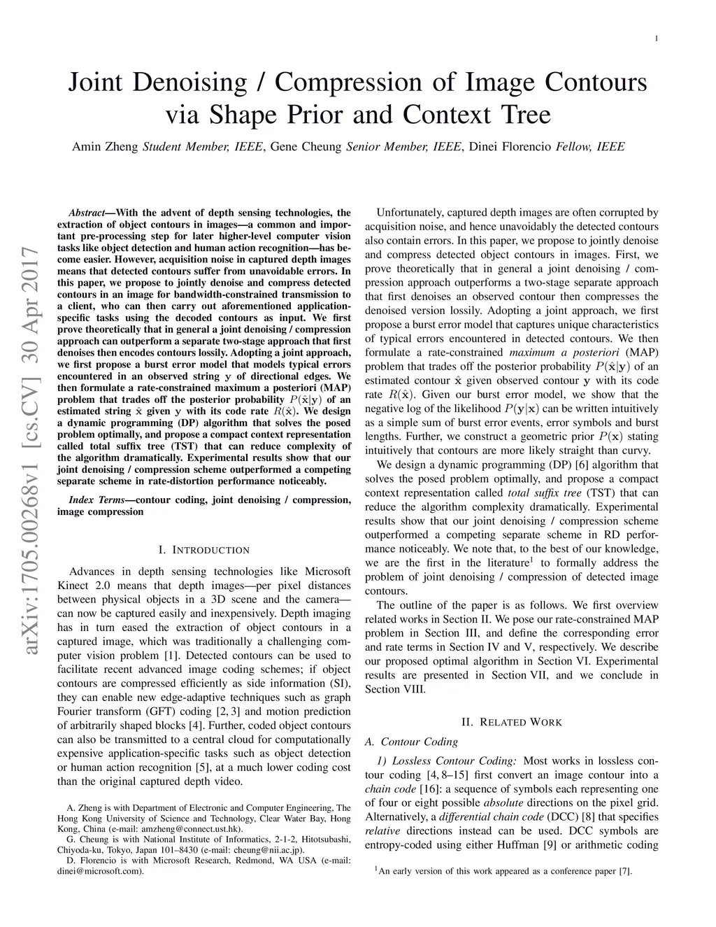 With the advent of depth sensing technologies, the extraction of object contours in images---a common and important pre-processing step for later higher-level computer vision tasks like object detection and human action recognition---has become easier. However, acquisition noise in captured depth images means that detected contours suffer from unavoidable errors. In this paper, we propose to jointly denoise and compress detected contours in an image for bandwidth-constrained transmission to a client, who can then carry out aforementioned application-specific tasks using the decoded contours as input. We first prove theoretically that in general a joint denoising / compression approach can outperform a separate two-stage approach that first denoises then encodes contours lossily. Adopting a joint approach, we first propose a burst error model that models typical errors encountered in an observed string y of directional edges. We then formulate a rate-constrained maximum a posteriori (MAP) problem that trades off the posterior probability p(x'|y) of an estimated string x' given y with its code rate R(x'). We design a dynamic programming (DP) algorithm that solves the posed problem optimally, and propose a compact context representation called total suffix tree (TST) that can reduce complexity of the algorithm dramatically. Experimental results show that our joint denoising / compression scheme outperformed a competing separate scheme in rate-distortion performance noticeably.