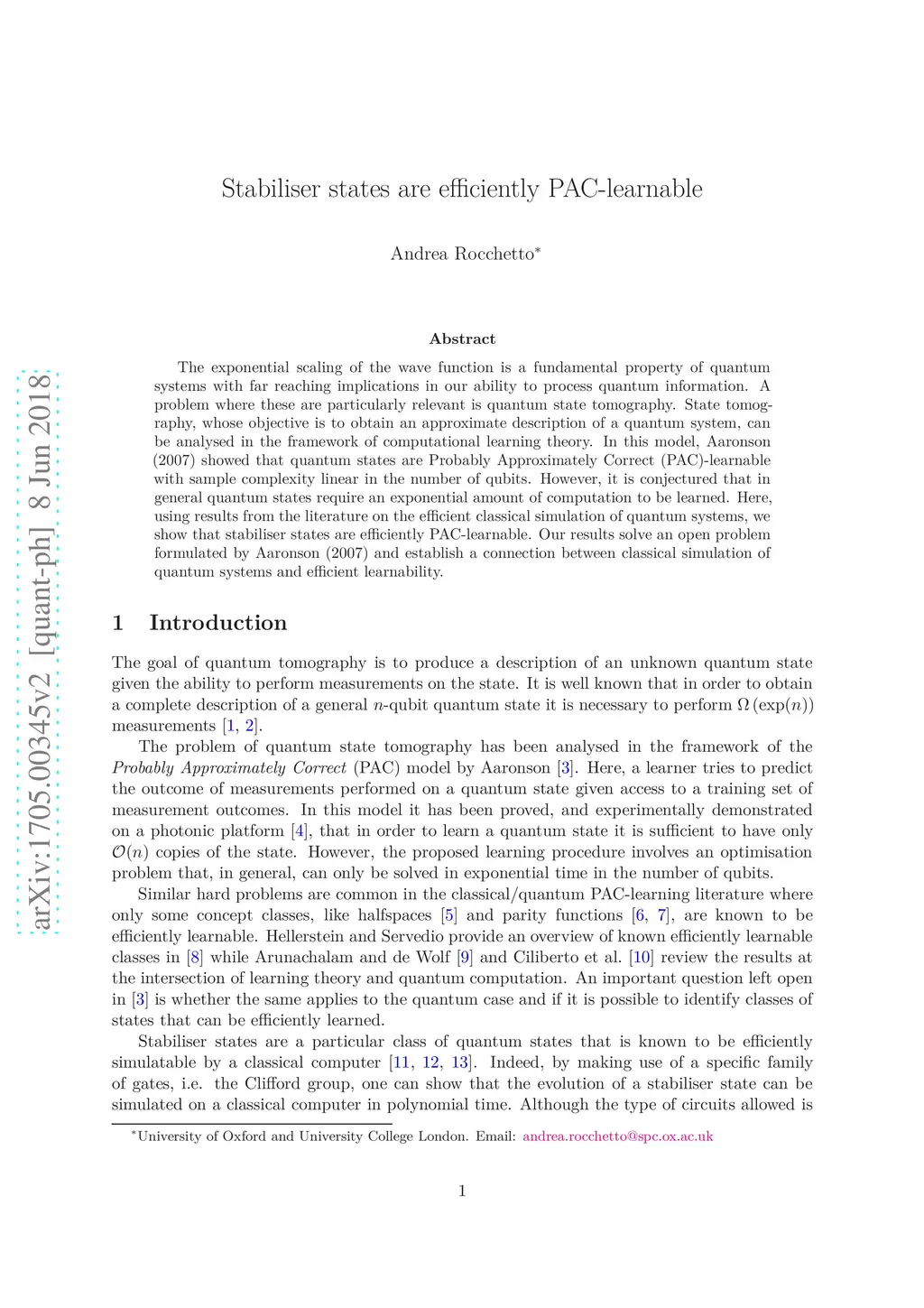 The exponential scaling of the wave function is a fundamental property of quantum systems with far reaching implications in our ability to process quantum information. A problem where these are particularly relevant is quantum state tomography. State tomography, whose objective is to obtain a full description of a quantum system, can be analysed in the framework of computational learning theory. In this model, quantum states have been shown to be Probably Approximately Correct (PAC)-learnable with sample complexity linear in the number of qubits. However, it is conjectured that in general quantum states require an exponential amount of computation to be learned. Here, using results from the literature on the efficient classical simulation of quantum systems, we show that stabiliser states are efficiently PAC-learnable. Our results solve an open problem formulated by Aaronson [Proc. R. Soc. A, 2088, (2007)] and propose learning theory as a tool for exploring the power of quantum computation.
