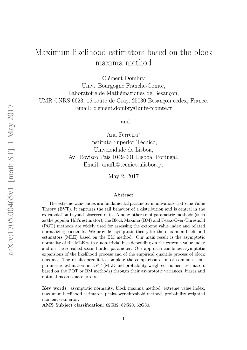 The extreme value index is a fundamental parameter in univariate Extreme Value Theory (EVT). It captures the tail behavior of a distribution and is central in the extrapolation beyond observed data. Among other semi-parametric methods (such as the popular Hill's estimator), the Block Maxima (BM) and Peaks-Over-Threshold (POT) methods are widely used for assessing the extreme value index and related normalizing constants. We provide asymptotic theory for the maximum likelihood estimators (MLE) based on the BM method. Our main result is the asymptotic normality of the MLE with a non-trivial bias depending on the extreme value index and on the so-called second order parameter. Our approach combines asymptotic expansions of the likelihood process and of the empirical quantile process of block maxima. The results permit to complete the comparison of most common semi-parametric estimators in EVT (MLE and probability weighted moment estimators based on the POT or BM methods) through their asymptotic variances, biases and optimal mean square errors.