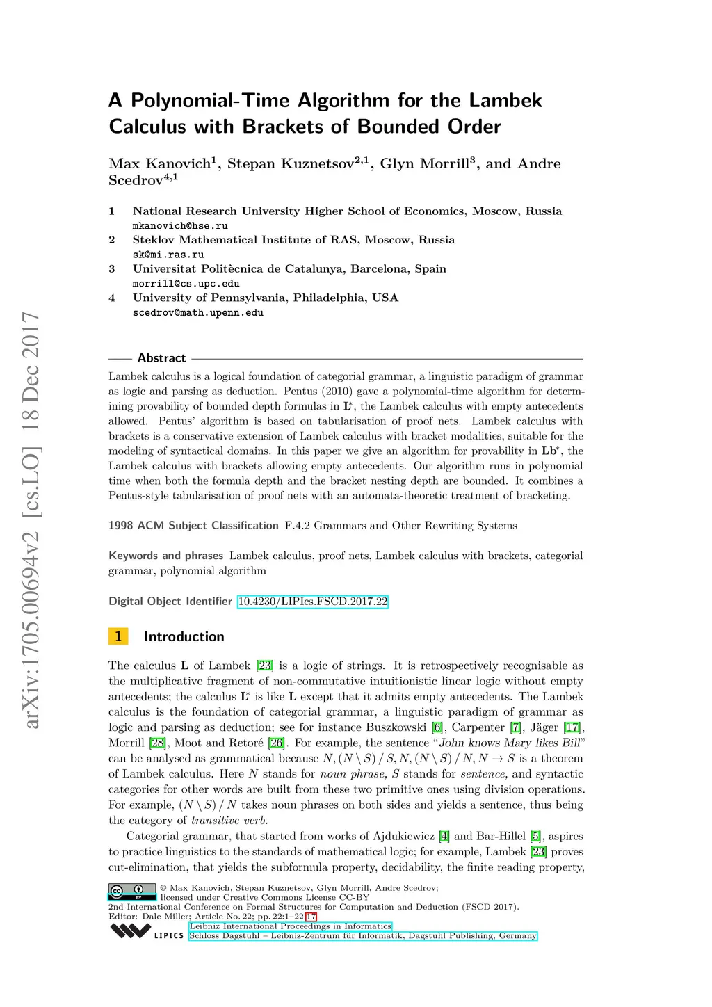 A polynomial time algorithm for the Lambek calculus with brackets of