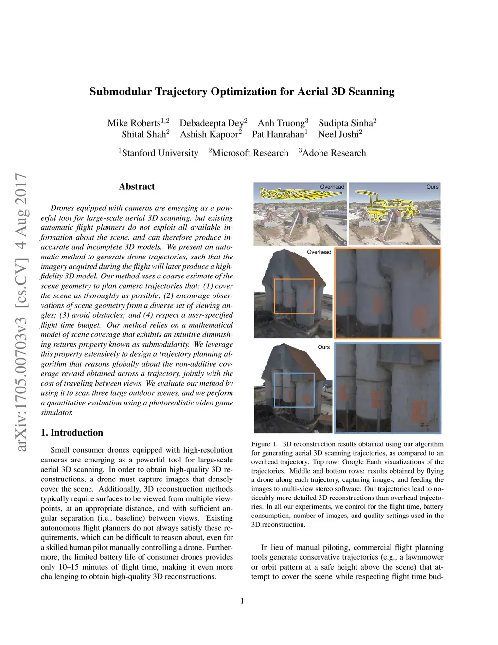 Drones equipped with cameras are emerging as a powerful tool for large-scale aerial 3D scanning, but existing automatic flight planners do not exploit all available information about the scene, and can therefore produce inaccurate and incomplete 3D models. We present an automatic method to generate drone trajectories, such that the imagery acquired during the flight will later produce a high-fidelity 3D model. Our method uses a coarse estimate of the scene geometry to plan camera trajectories that: (1) cover the scene as thoroughly as possible; (2) encourage observations of scene geometry from a diverse set of viewing angles; (3) avoid obstacles; and (4) respect a user-specified flight time budget. Our method relies on a mathematical model of scene coverage that exhibits an intuitive diminishing returns property known as submodularity. We leverage this property extensively to design a trajectory planning algorithm that reasons globally about the non-additive coverage reward obtained across a trajectory, jointly with the cost of traveling between views. We evaluate our method by using it to scan three large outdoor scenes, and we perform a quantitative evaluation using a photorealistic video game simulator.