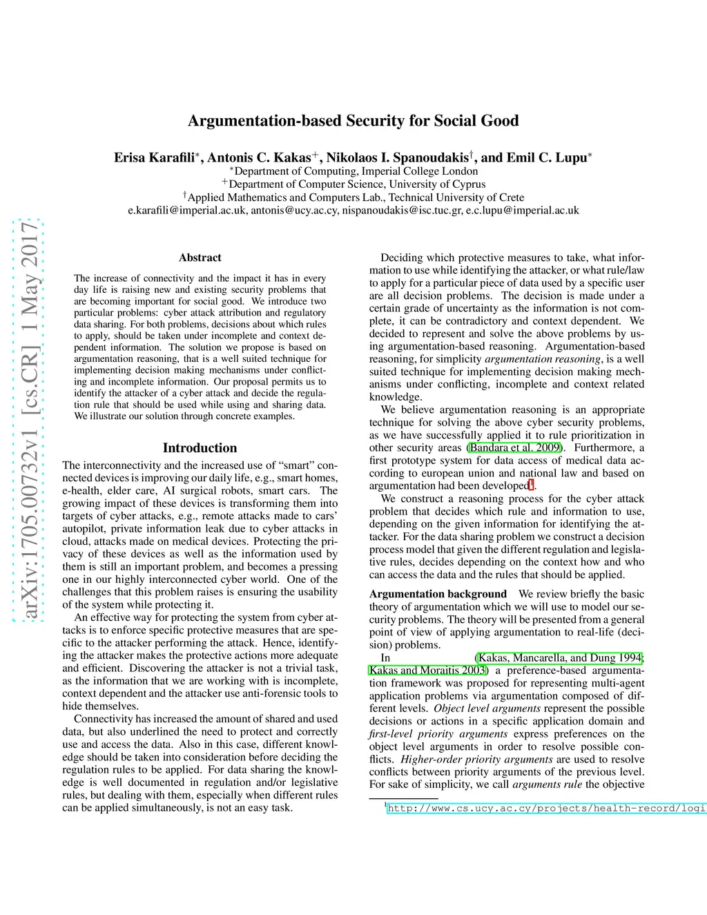 The increase of connectivity and the impact it has in every day life is raising new and existing security problems that are becoming important for social good. We introduce two particular problems: cyber attack attribution and regulatory data sharing. For both problems, decisions about which rules to apply, should be taken under incomplete and context dependent information. The solution we propose is based on argumentation reasoning, that is a well suited technique for implementing decision making mechanisms under conflicting and incomplete information. Our proposal permits us to identify the attacker of a cyber attack and decide the regulation rule that should be used while using and sharing data. We illustrate our solution through concrete examples.
