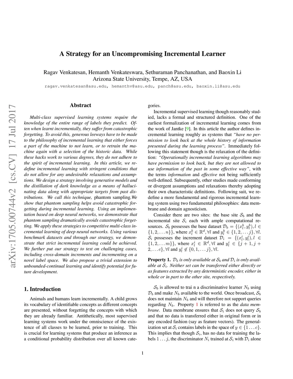Multi-class supervised learning systems require the knowledge of the entire range of labels they predict. Often when learnt incrementally, they suffer from catastrophic forgetting. To avoid this, generous leeways have to be made to the philosophy of incremental learning that either forces a part of the machine to not learn, or to retrain the machine again with a selection of the historic data. While these hacks work to various degrees, they do not adhere to the spirit of incremental learning. In this article, we redefine incremental learning with stringent conditions that do not allow for any undesirable relaxations and assumptions. We design a strategy involving generative models and the distillation of dark knowledge as a means of hallucinating data along with appropriate targets from past distributions. We call this technique, phantom sampling.We show that phantom sampling helps avoid catastrophic forgetting during incremental learning. Using an implementation based on deep neural networks, we demonstrate that phantom sampling dramatically avoids catastrophic forgetting. We apply these strategies to competitive multi-class incremental learning of deep neural networks. Using various benchmark datasets and through our strategy, we demonstrate that strict incremental learning could be achieved. We further put our strategy to test on challenging cases, including cross-domain increments and incrementing on a novel label space. We also propose a trivial extension to unbounded-continual learning and identify potential for future development.