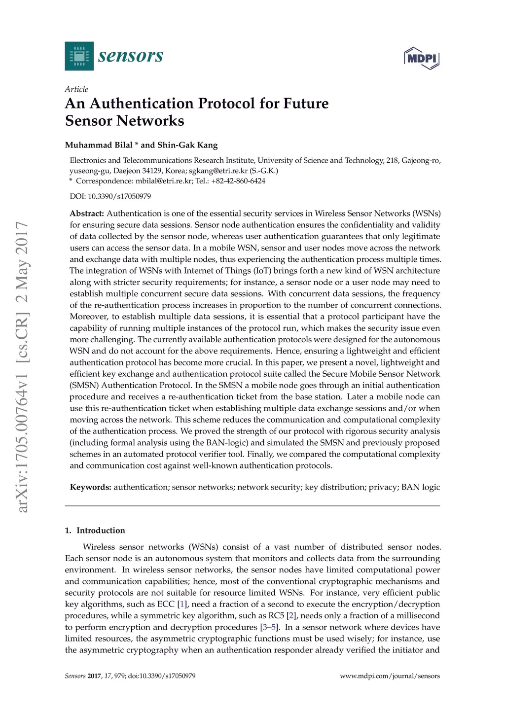 Authentication is one of the essential security services in Wireless Sensor Networks (WSNs) for ensuring secure data sessions. Sensor node authentication ensures the confidentiality and validity of data collected by the sensor node, whereas user authentication guarantees that only legitimate users can access the sensor data. In a mobile WSN, sensor and user nodes move across the network and exchange data with multiple nodes, thus experiencing the authentication process multiple times. The integration of WSNs with Internet of Things (IoT) brings forth a new kind of WSN architecture along with stricter security requirements; for instance, a sensor node or a user node may need to establish multiple concurrent secure data sessions. With concurrent data sessions, the frequency of the re-authentication process increases in proportion to the number of concurrent connections, which makes the security issue even more challenging. The currently available authentication protocols were designed for the autonomous WSN and do not account for the above requirements. In this paper, we present a novel, lightweight and efficient key exchange and authentication protocol suite called the Secure Mobile Sensor Network (SMSN) Authentication Protocol. In the SMSN a mobile node goes through an initial authentication procedure and receives a re-authentication ticket from the base station. Later a mobile node can use this re-authentication ticket when establishing multiple data exchange sessions and/or when moving across the network. This scheme reduces the communication and computational complexity of the authentication process. We proved the strength of our protocol with rigorous security analysis and simulated the SMSN and previously proposed schemes in an automated protocol verifier tool. Finally, we compared the computational complexity and communication cost against well-known authentication protocols.