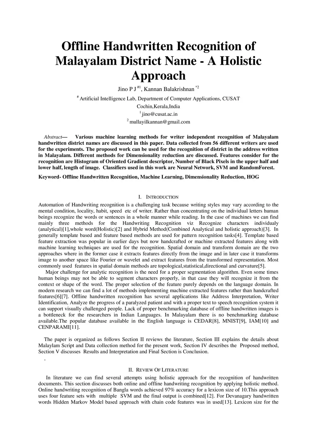 Offline Handwritten Recognition of Malayalam District Name - A Holistic