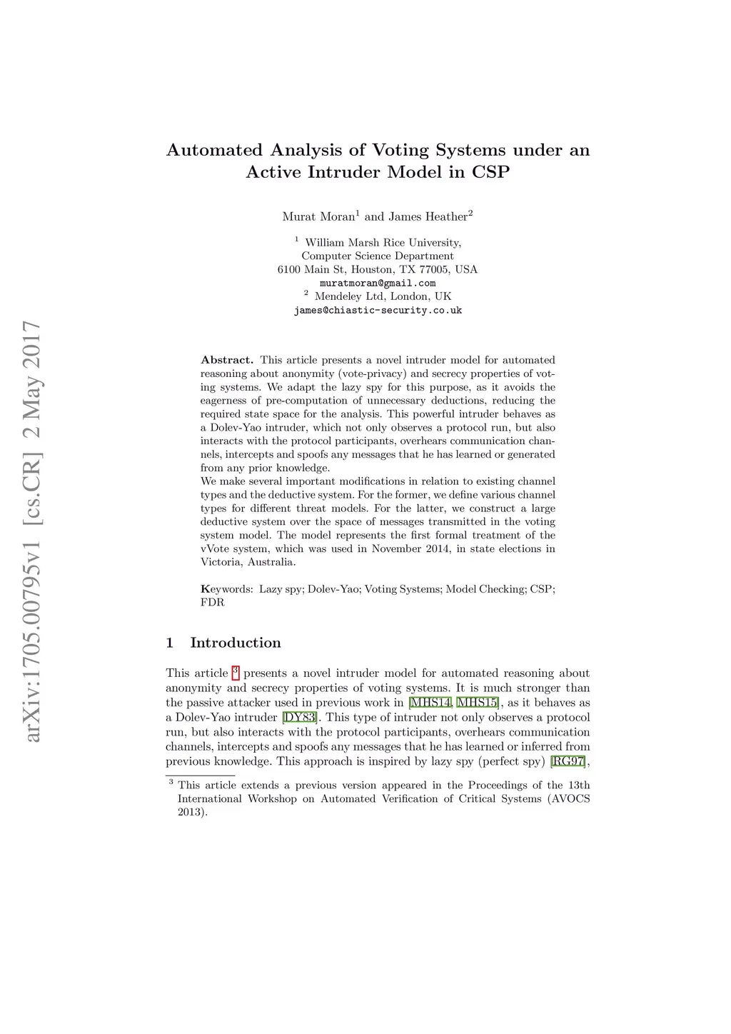 This article presents a novel intruder model for automated reasoning about anonymity (vote-privacy) and secrecy properties of voting systems. We adapt the lazy spy for this purpose, as it avoids the eagerness of pre-computation of unnecessary deductions, reducing the required state space for the analysis. This powerful intruder behaves as a Dolev-Yao intruder, which not only observes a protocol run but also interacts with the protocol participants, overhears communication channels, intercepts and spoofs any messages that he has learned or generated from any prior knowledge. We make several important modifications in relation to existing channel types and the deductive system. For the former, we define various channel types for different threat models. For the latter, we construct a large deductive system over the space of messages transmitted in the voting system model. The model represents the first formal treatment of the vVote system, which was used in November 2014, in state elections in Victoria, Australia.