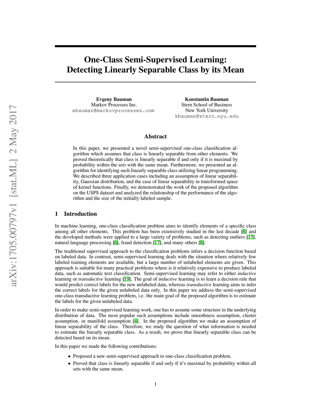 In this paper, we presented a novel semi-supervised one-class classification algorithm which assumes that class is linearly separable from other elements. We proved theoretically that class is linearly separable if and only if it is maximal by probability within the sets with the same mean. Furthermore, we presented an algorithm for identifying such linearly separable class utilizing linear programming. We described three application cases including an assumption of linear separability, Gaussian distribution, and the case of linear separability in transformed space of kernel functions. Finally, we demonstrated the work of the proposed algorithm on the USPS dataset and analyzed the relationship of the performance of the algorithm and the size of the initially labeled sample.