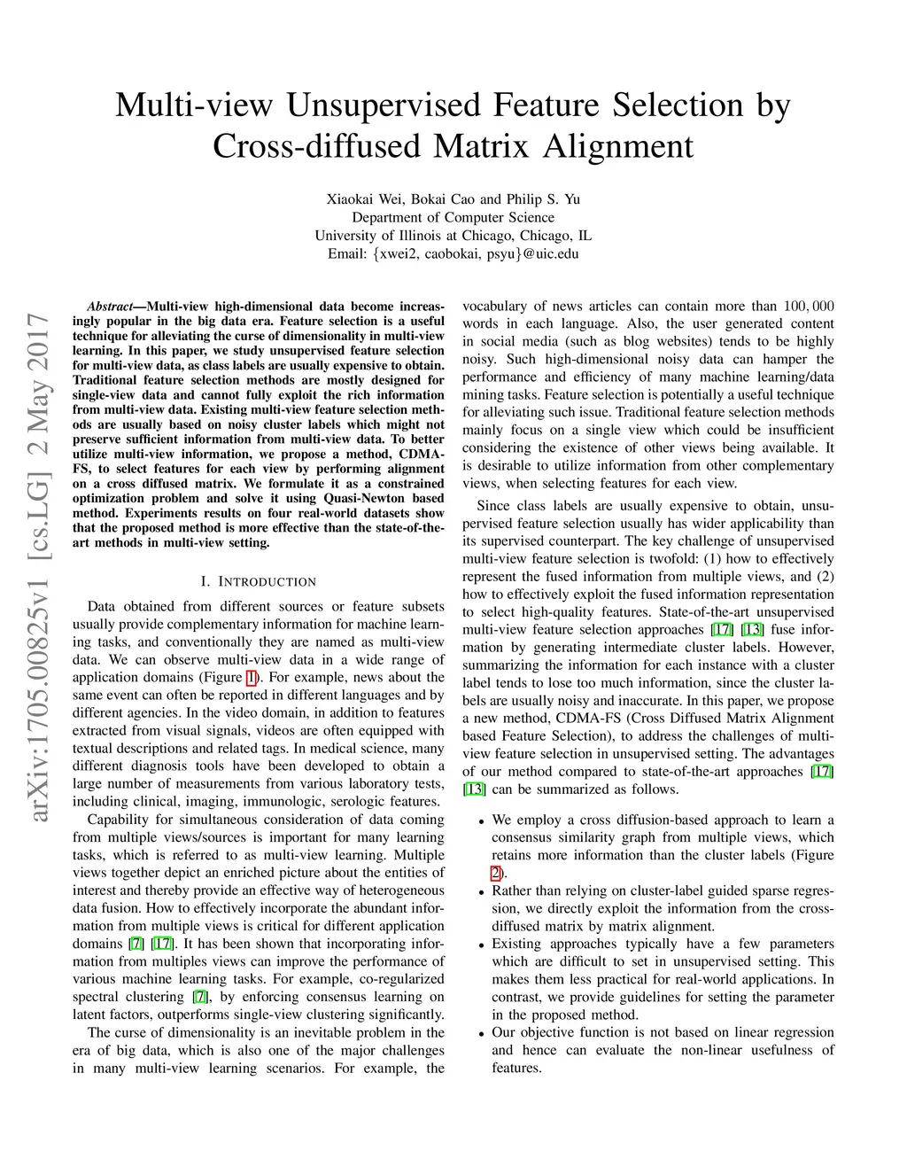 Multi-view Unsupervised Feature Selection by Cross-diffused Matrix