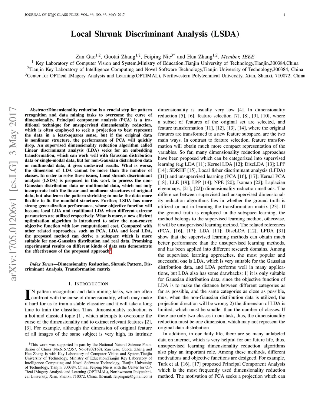 Dimensionality reduction is a crucial step for pattern recognition and data mining tasks to overcome the curse of dimensionality. Principal component analysis (PCA) is a traditional technique for unsupervised dimensionality reduction, which is often employed to seek a projection to best represent the data in a least-squares sense, but if the original data is nonlinear structure, the performance of PCA will quickly drop. An supervised dimensionality reduction algorithm called Linear discriminant analysis (LDA) seeks for an embedding transformation, which can work well with Gaussian distribution data or single-modal data, but for non-Gaussian distribution data or multimodal data, it gives undesired results. What is worse, the dimension of LDA cannot be more than the number of classes. In order to solve these issues, Local shrunk discriminant analysis (LSDA) is proposed in this work to process the non-Gaussian distribution data or multimodal data, which not only incorporate both the linear and nonlinear structures of original data, but also learn the pattern shrinking to make the data more flexible to fit the manifold structure. Further, LSDA has more strong generalization performance, whose objective function will become local LDA and traditional LDA when different extreme parameters are utilized respectively. What is more, a new efficient optimization algorithm is introduced to solve the non-convex objective function with low computational cost. Compared with other related approaches, such as PCA, LDA and local LDA, the proposed method can derive a subspace which is more suitable for non-Gaussian distribution and real data. Promising experimental results on different kinds of data sets demonstrate the effectiveness of the proposed approach.