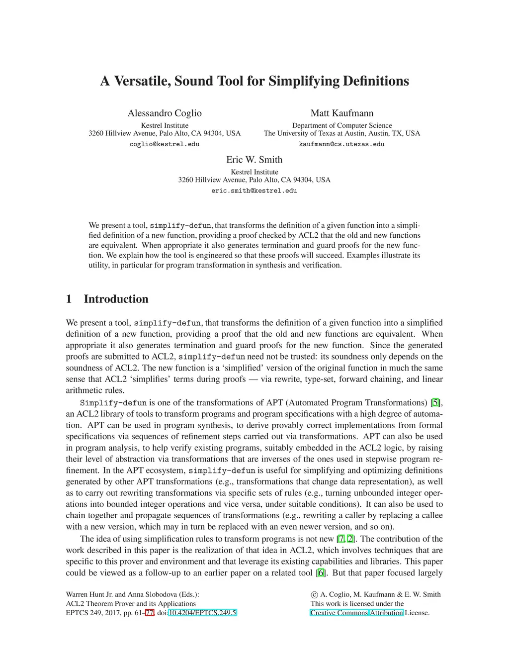 We present a tool, simplify-defun, that transforms the definition of a given function into a simplified definition of a new function, providing a proof checked by ACL2 that the old and new functions are equivalent. When appropriate it also generates termination and guard proofs for the new function. We explain how the tool is engineered so that these proofs will succeed. Examples illustrate its utility, in particular for program transformation in synthesis and verification.