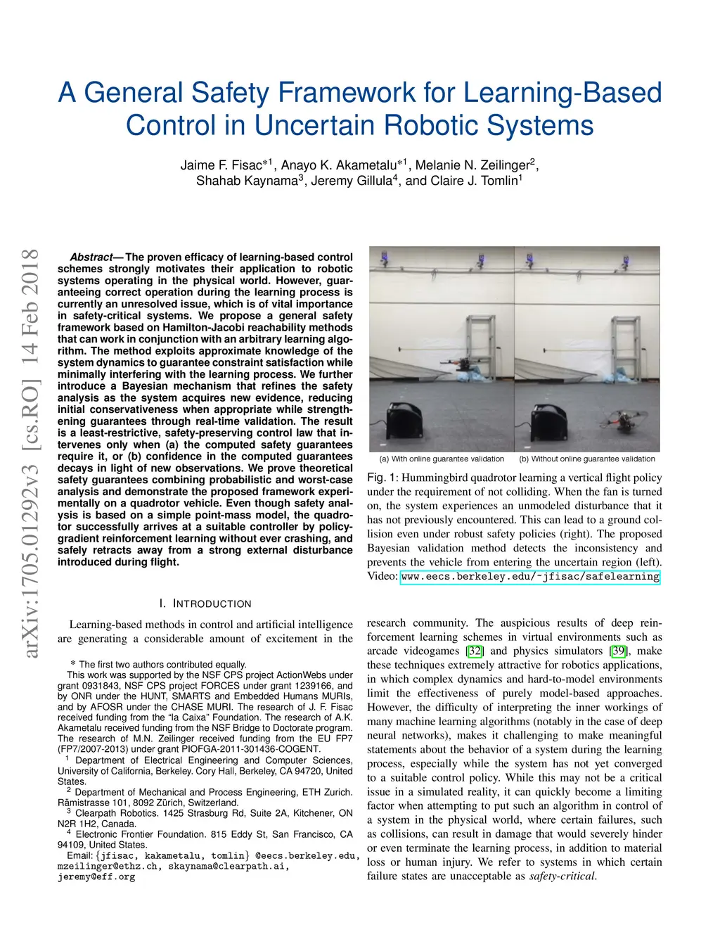 The proven efficacy of learning-based control schemes strongly motivates their application to robotic systems operating in the physical world. However, guaranteeing correct operation during the learning process is currently an unresolved issue, which is of vital importance in safety-critical systems. We propose a general safety framework based on Hamilton-Jacobi reachability methods that can work in conjunction with an arbitrary learning algorithm. The method exploits approximate knowledge of the system dynamics to guarantee constraint satisfaction while minimally interfering with the learning process. We further introduce a Bayesian mechanism that refines the safety analysis as the system acquires new evidence, reducing initial conservativeness when appropriate while strengthening guarantees through real-time validation. The result is a least-restrictive, safety-preserving control law that intervenes only when (a) the computed safety guarantees require it, or (b) confidence in the computed guarantees decays in light of new observations. We prove theoretical safety guarantees combining probabilistic and worst-case analysis and demonstrate the proposed framework experimentally on a quadrotor vehicle. Even though safety analysis is based on a simple point-mass model, the quadrotor successfully arrives at a suitable controller by policy-gradient reinforcement learning without ever crashing, and safely retracts away from a strong external disturbance introduced during flight.