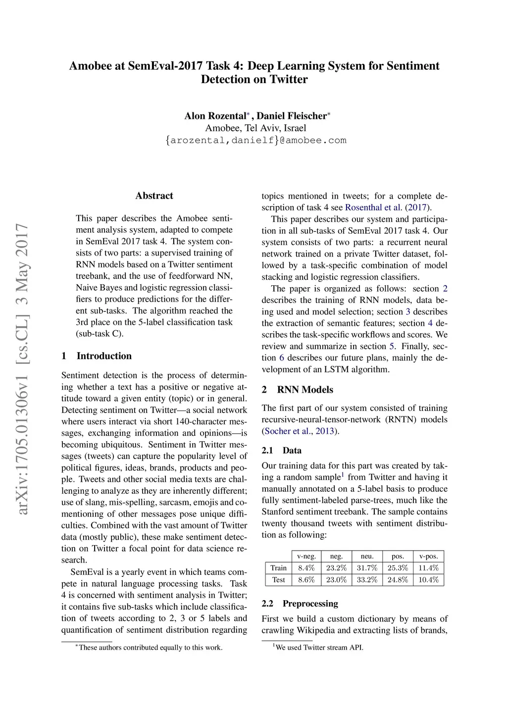 This paper describes the Amobee sentiment analysis system, adapted to compete in SemEval 2017 task 4. The system consists of two parts: a supervised training of RNN models based on a Twitter sentiment treebank, and the use of feedforward NN, Naive Bayes and logistic regression classifiers to produce predictions for the different sub-tasks. The algorithm reached the 3rd place on the 5-label classification task (sub-task C).