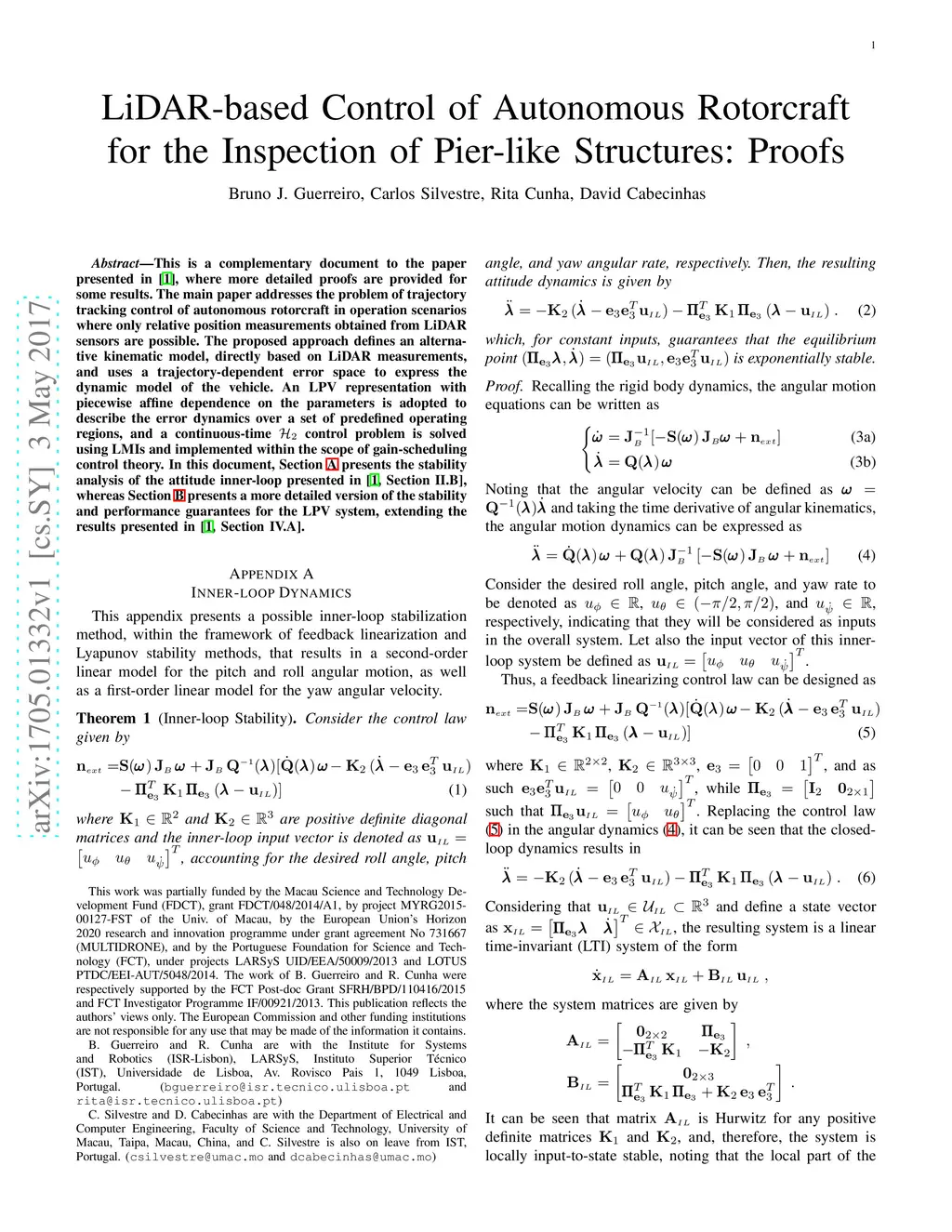 This is a complementary document to the paper presented in [1], to provide more detailed proofs for some results. The main paper addresses the problem of trajectory tracking control of autonomous rotorcraft in operation scenarios where only relative position measurements obtained from LiDAR sensors are possible. The proposed approach defines an alternative kinematic model, directly based on LiDAR measurements, and uses a trajectory-dependent error space to express the dynamic model of the vehicle. An LPV representation with piecewise affine dependence on the parameters is adopted to describe the error dynamics over a set of predefined operating regions, and a continuous-time control problem is solved using LMIs and implemented within the scope of gain-scheduling control theory.