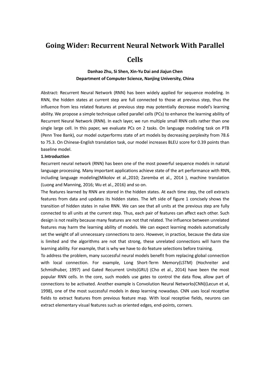Going Wider: Recurrent Neural Network With Parallel Cells