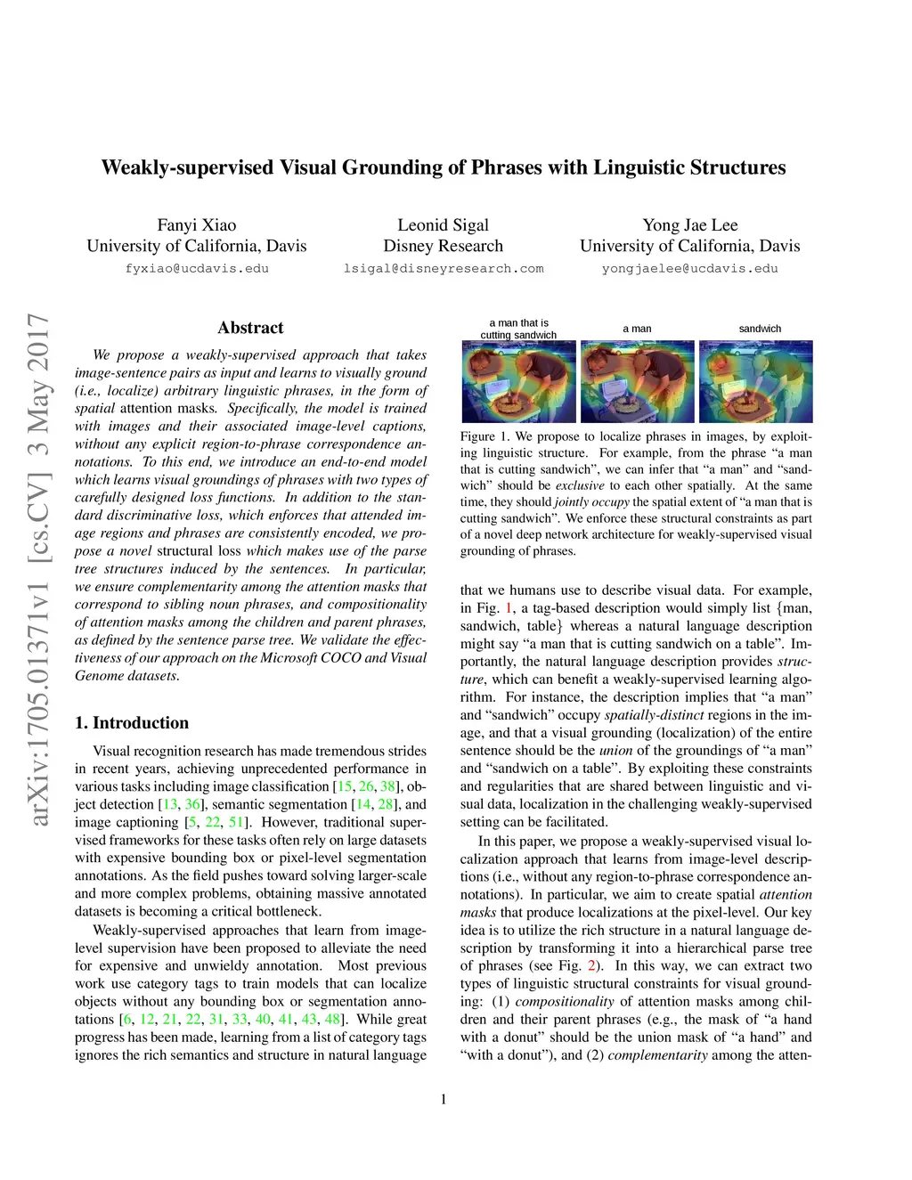 We propose a weakly-supervised approach that takes image-sentence pairs as input and learns to visually ground (i.e., localize) arbitrary linguistic phrases, in the form of spatial attention masks. Specifically, the model is trained with images and their associated image-level captions, without any explicit region-to-phrase correspondence annotations. To this end, we introduce an end-to-end model which learns visual groundings of phrases with two types of carefully designed loss functions. In addition to the standard discriminative loss, which enforces that attended image regions and phrases are consistently encoded, we propose a novel structural loss which makes use of the parse tree structures induced by the sentences. In particular, we ensure complementarity among the attention masks that correspond to sibling noun phrases, and compositionality of attention masks among the children and parent phrases, as defined by the sentence parse tree. We validate the effectiveness of our approach on the Microsoft COCO and Visual Genome datasets.