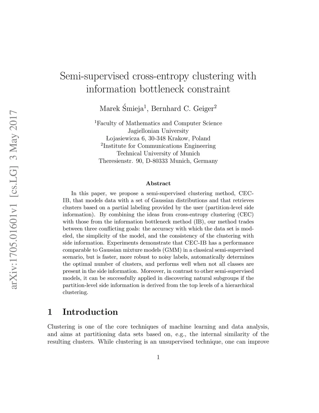In this paper, we propose a semi-supervised clustering method, CEC-IB, that models data with a set of Gaussian distributions and that retrieves clusters based on a partial labeling provided by the user (partition-level side information). By combining the ideas from cross-entropy clustering (CEC) with those from the information bottleneck method (IB), our method trades between three conflicting goals: the accuracy with which the data set is modeled, the simplicity of the model, and the consistency of the clustering with side information. Experiments demonstrate that CEC-IB has a performance comparable to Gaussian mixture models (GMM) in a classical semi-supervised scenario, but is faster, more robust to noisy labels, automatically determines the optimal number of clusters, and performs well when not all classes are present in the side information. Moreover, in contrast to other semi-supervised models, it can be successfully applied in discovering natural subgroups if the partition-level side information is derived from the top levels of a hierarchical clustering.