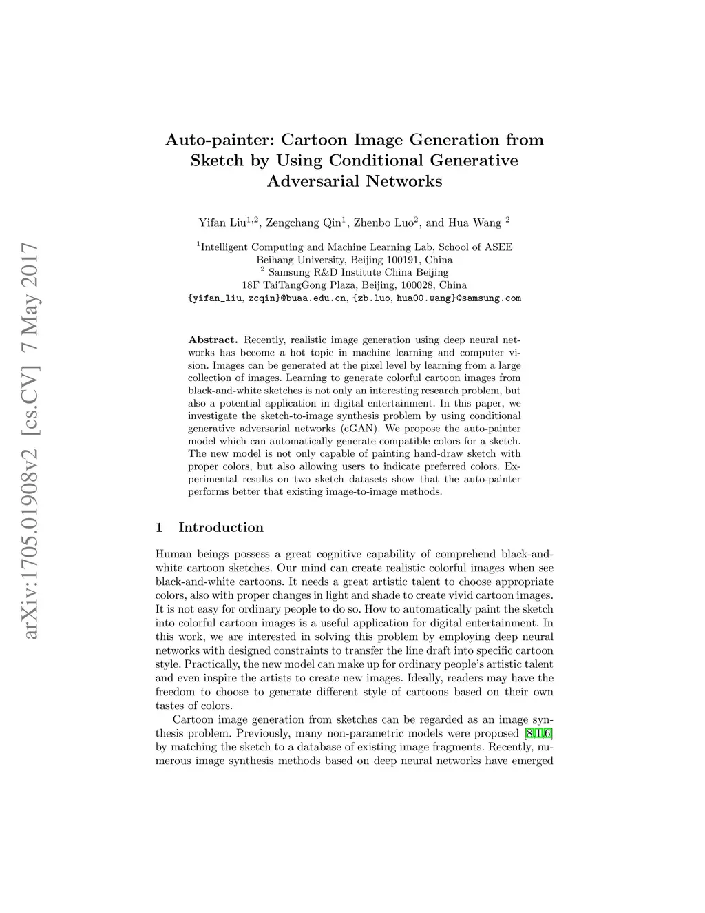 Auto-painter: Cartoon Image Generation from Sketch by Using Conditional