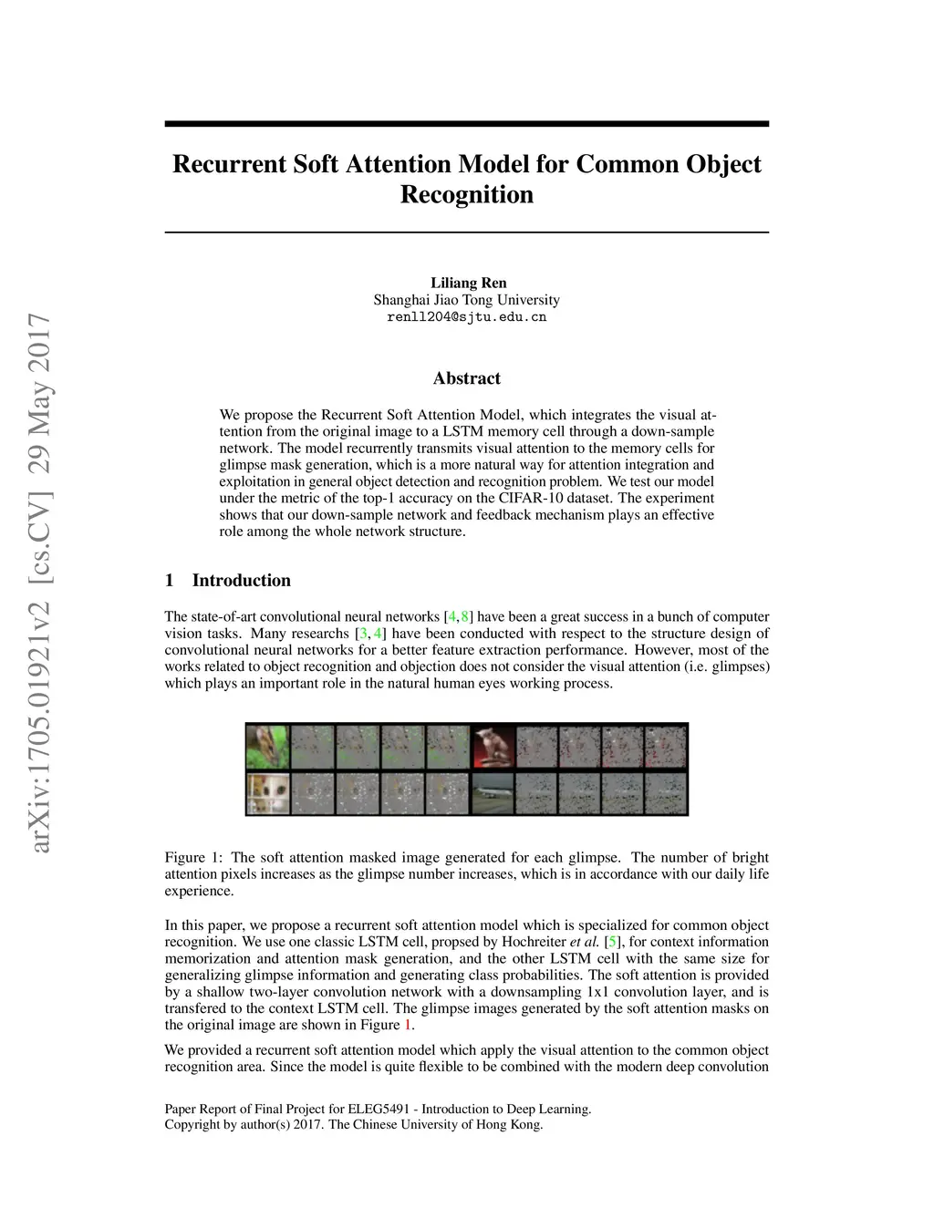 We propose the Recurrent Soft Attention Model, which integrates the visual attention from the original image to a LSTM memory cell through a down-sample network. The model recurrently transmits visual attention to the memory cells for glimpse mask generation, which is a more natural way for attention integration and exploitation in general object detection and recognition problem. We test our model under the metric of the top-1 accuracy on the CIFAR-10 dataset. The experiment shows that our down-sample network and feedback mechanism plays an effective role among the whole network structure.