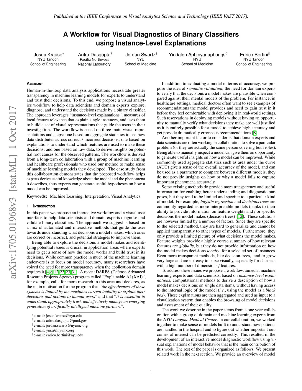 Human-in-the-loop data analysis applications necessitate greater transparency in machine learning models for experts to understand and trust their decisions. To this end, we propose a visual analytics workflow to help data scientists and domain experts explore, diagnose, and understand the decisions made by a binary classifier. The approach leverages "instance-level explanations", measures of local feature relevance that explain single instances, and uses them to build a set of visual representations that guide the users in their investigation. The workflow is based on three main visual representations and steps: one based on aggregate statistics to see how data distributes across correct / incorrect decisions; one based on explanations to understand which features are used to make these decisions; and one based on raw data, to derive insights on potential root causes for the observed patterns. The workflow is derived from a long-term collaboration with a group of machine learning and healthcare professionals who used our method to make sense of machine learning models they developed. The case study from this collaboration demonstrates that the proposed workflow helps experts derive useful knowledge about the model and the phenomena it describes, thus experts can generate useful hypotheses on how a model can be improved.