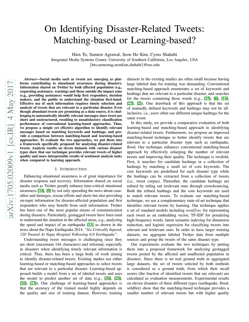 Social media such as tweets are emerging as platforms contributing to situational awareness during disasters. Information shared on Twitter by both affected population (e.g., requesting assistance, warning) and those outside the impact zone (e.g., providing assistance) would help first responders, decision makers, and the public to understand the situation first-hand. Effective use of such information requires timely selection and analysis of tweets that are relevant to a particular disaster. Even though abundant tweets are promising as a data source, it is challenging to automatically identify relevant messages since tweet are short and unstructured, resulting to unsatisfactory classification performance of conventional learning-based approaches. Thus, we propose a simple yet effective algorithm to identify relevant messages based on matching keywords and hashtags, and provide a comparison between matching-based and learning-based approaches. To evaluate the two approaches, we put them into a framework specifically proposed for analyzing disaster-related tweets. Analysis results on eleven datasets with various disaster types show that our technique provides relevant tweets of higher quality and more interpretable results of sentiment analysis tasks when compared to learning approach.